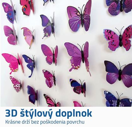 Dekoračný doplnok do každého interiéru – 3D motýle! Moderná, obľúbená a originálna dekorácia! Obsahom balenia je celkom 12 motýľov a arch lepiacej pásky. Motýľmi môžete vyzdobiť ktorúkoľvek miestnosť, všade budú vyzerať nádherne! Či už v obývacej izbe, spálni, chodbe, kuchyni, detskej izbe, ale tiež napríklad v kancelárii! Vhodné na stenu, skrinku, okno, zrkadlo, futro či chladničku.