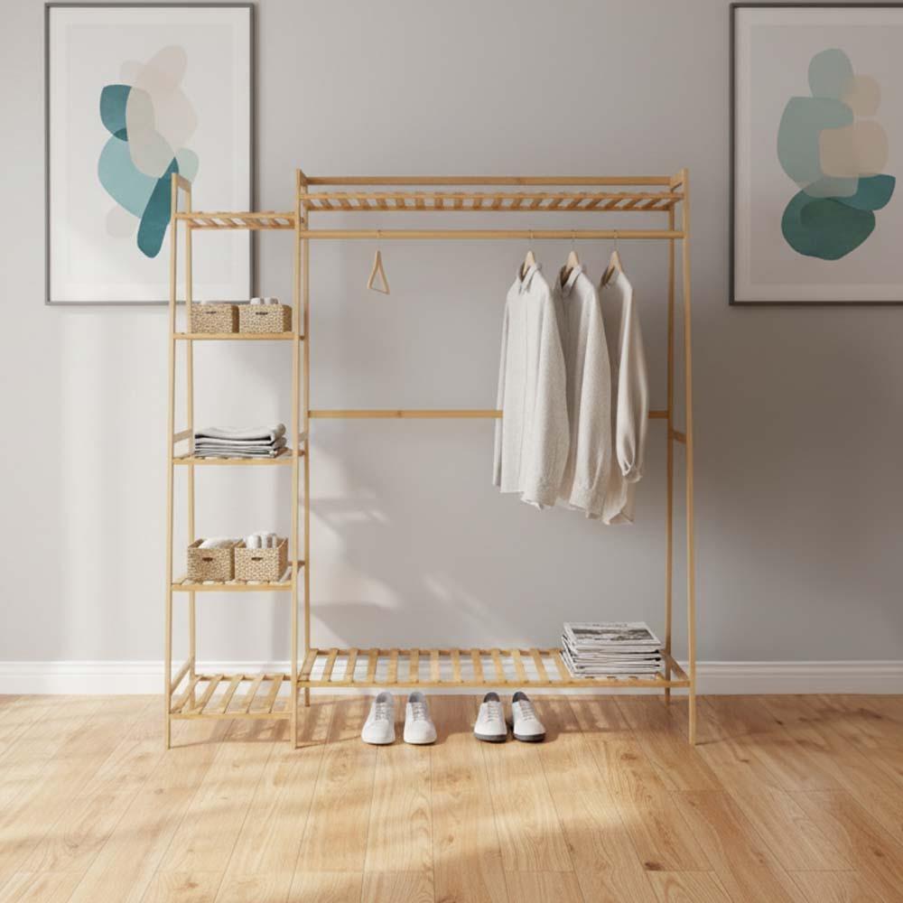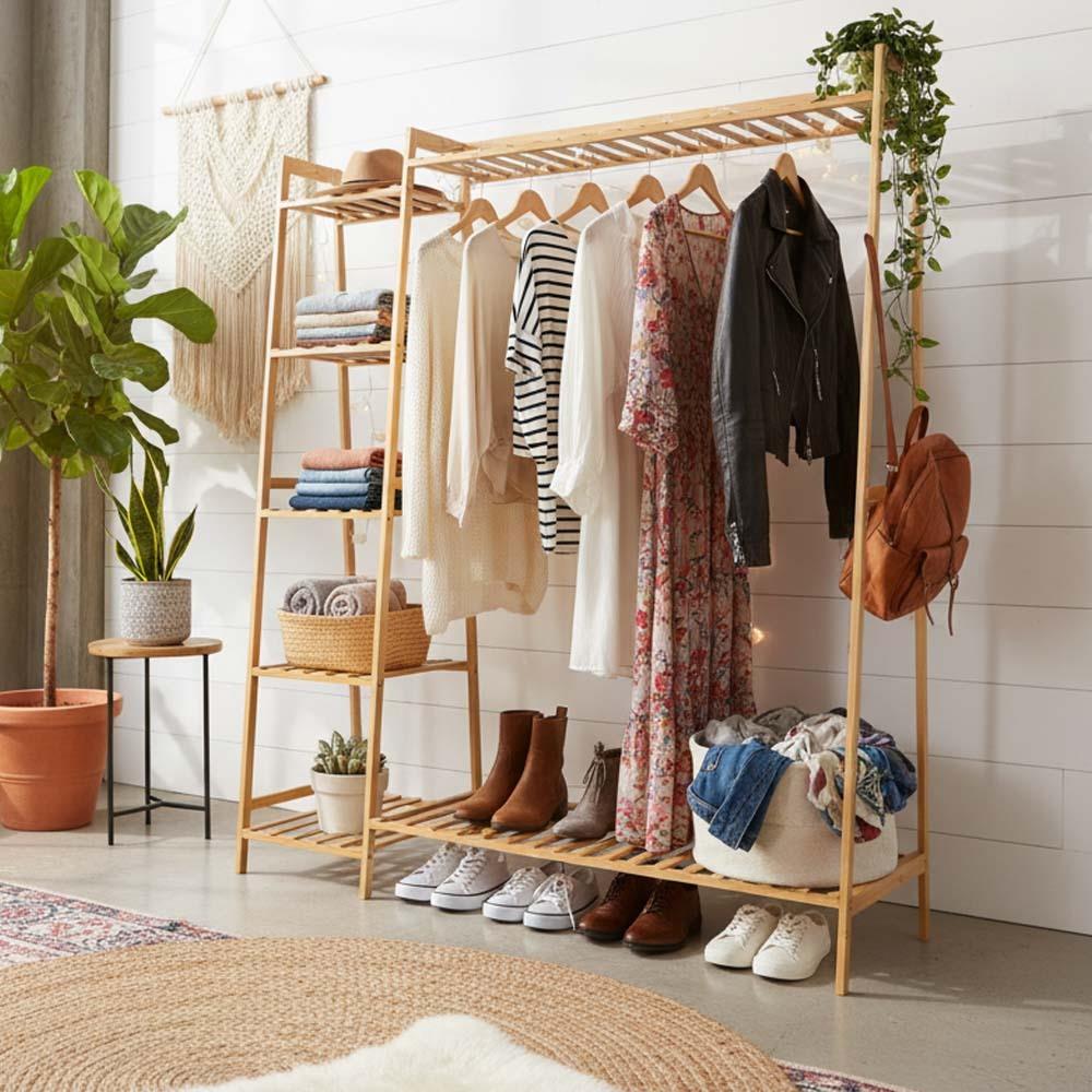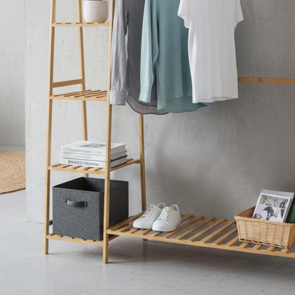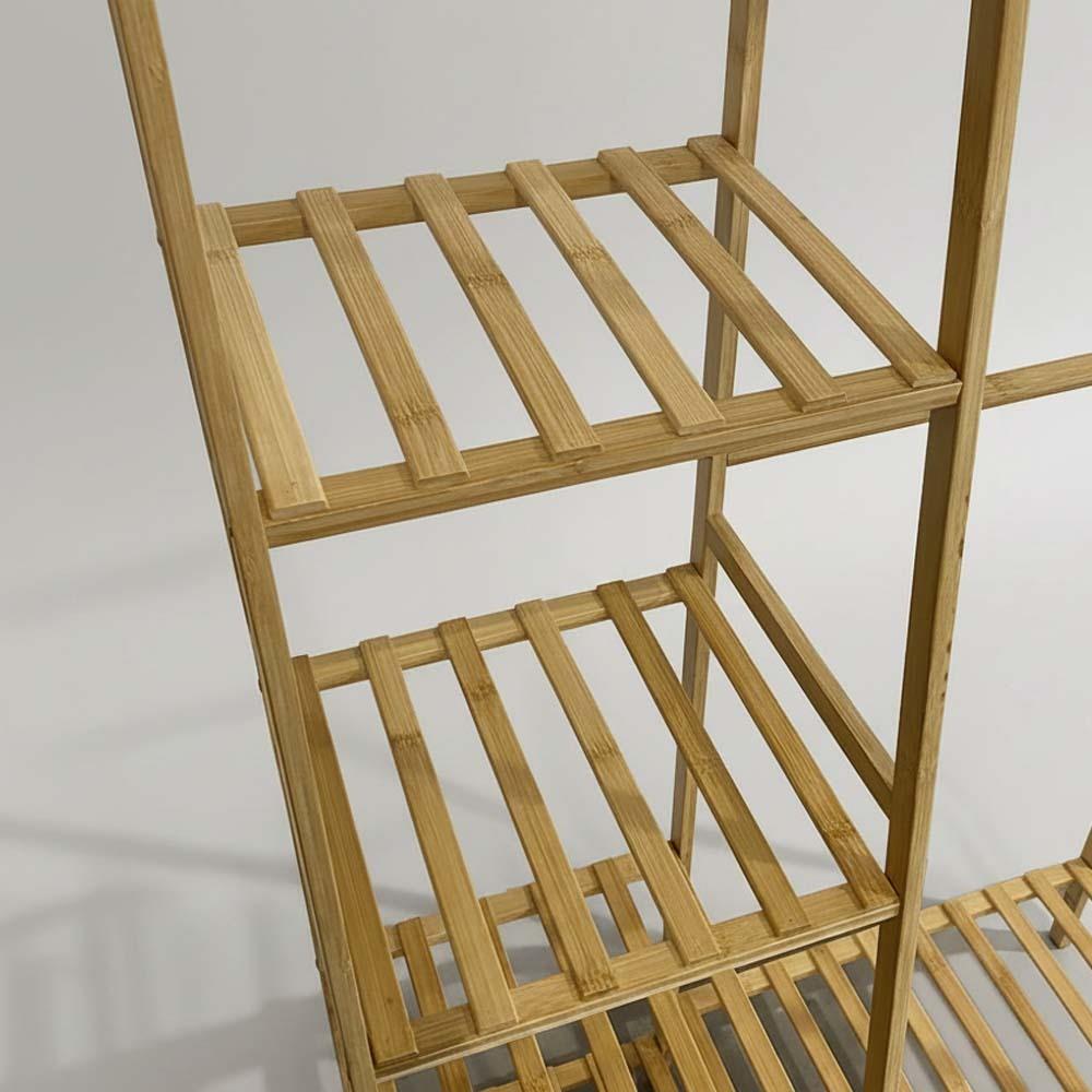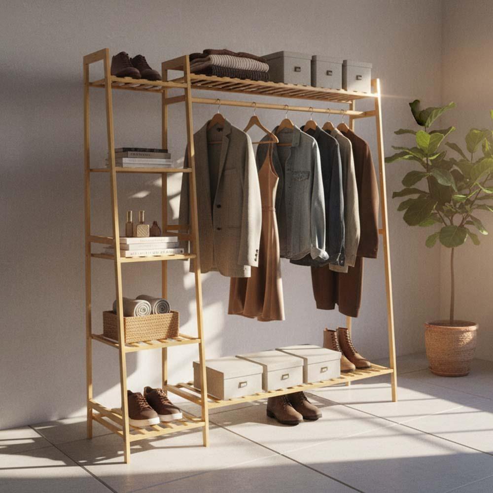 Bambusový stojan na oblečenie je ideálnym riešením pre každého, kto chce mať vo svojich veciach poriadok. Kombinuje praktický vešiak s policami, vďaka ktorým jednoducho zorganizujete oblečenie aj doplnky. Všetko budete mať prehľadne na jednom mieste. Prírodný dizajn dodá interiéru útulnú atmosféru a je vhodný do spálne, šatníka aj predsiene. Ponúka dostatok priestoru na každodenné využitie.