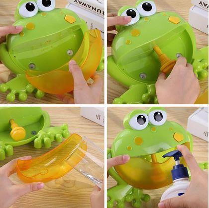 Najprv odskrutkujte zadný krytček na žabe, a vložte batérie. Žabu nalepte pomocou prísaviek na hladký rovný povrch – najlepšie dlaždice. Žabiu tlamu vyberte a naplňte vodou zmiešanou s mydlom alebo penou do kúpeľa. Čím viac mydla namiešate, tým viac bude bubliniek. Vložte do otvoru žltú trysku a tlamičku nasaďte späť. Teraz stačí zapnúť tlačidlo a zábava môže začať. S veselou žabou bude prípadný strach z vody prekonaný.