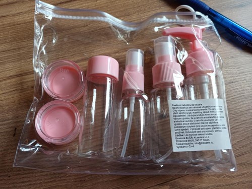 V sade nájdete 3 transparentné fľaštičky a jeden rozprašovač. Do fľaštičiek môžete naliať svoje obľúbené prípravky, ako uznáte za vhodné. Lievikom, ktorý je tiež súčasťou balenia, sa vám tekutiny budú dobre nalievať.