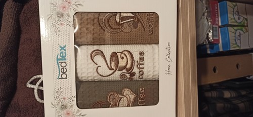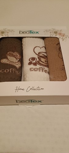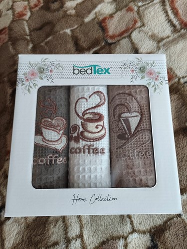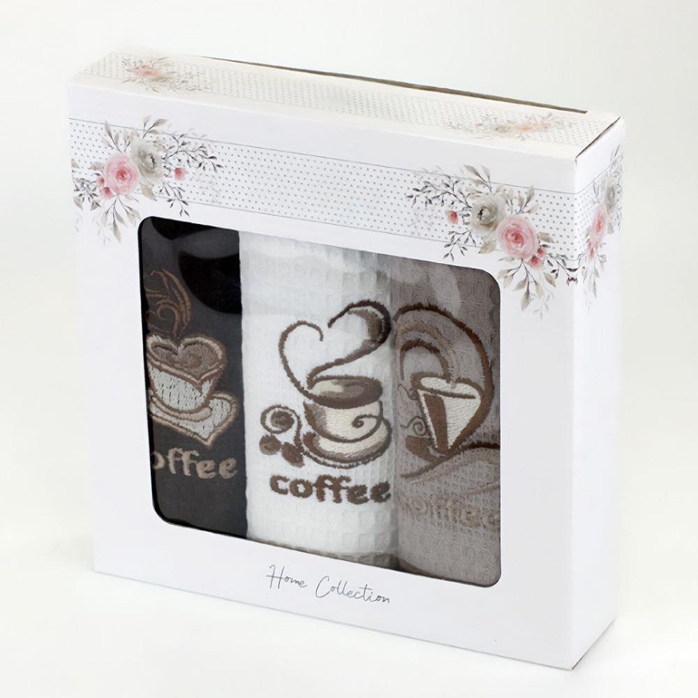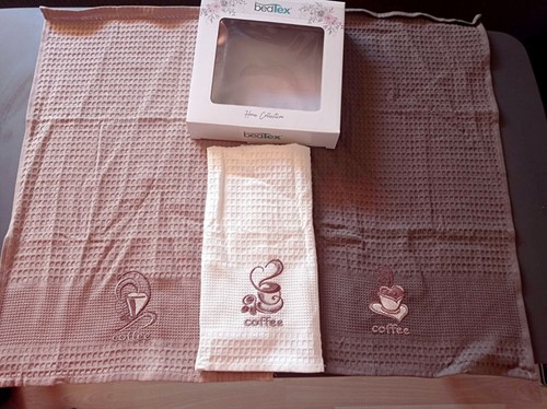 • Vaflové utierky v darčekovej sade s dekorom hrnčekov kávy a nápismi "coffee"