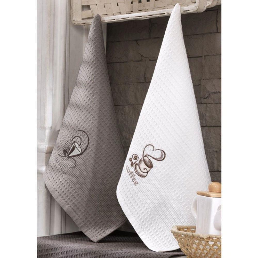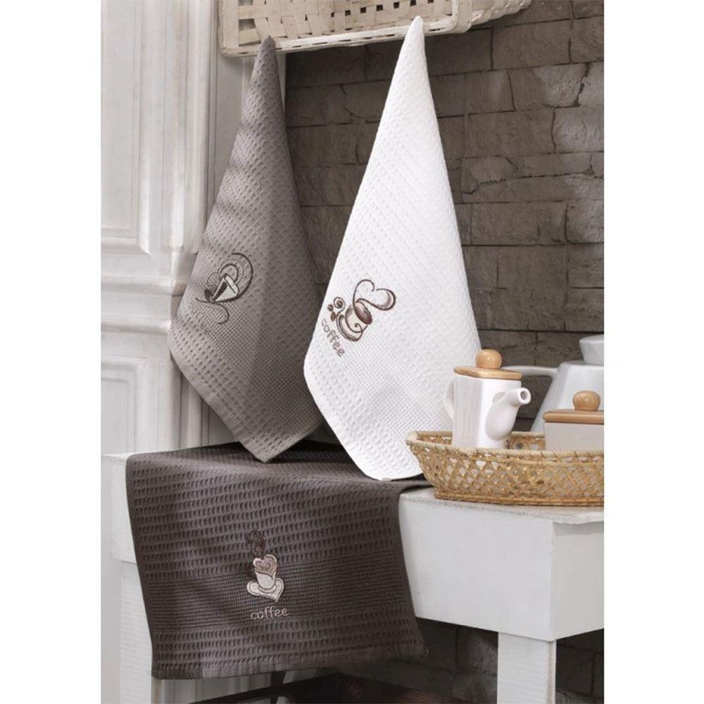 Vaflové utierky sú perfektným doplnkom pre každú kuchyňu a táto sada je ideálnym darčekom pre milovníkov kávy. Sú vyrobené zo 100% bavlny, čo zaručuje ich vysokú savosť a dlhú životnosť. Vaflový vzor s dekorom kávových hrnčekov a nápismi "coffee" dodáva kuchyni elegantný a štýlový vzhľad.