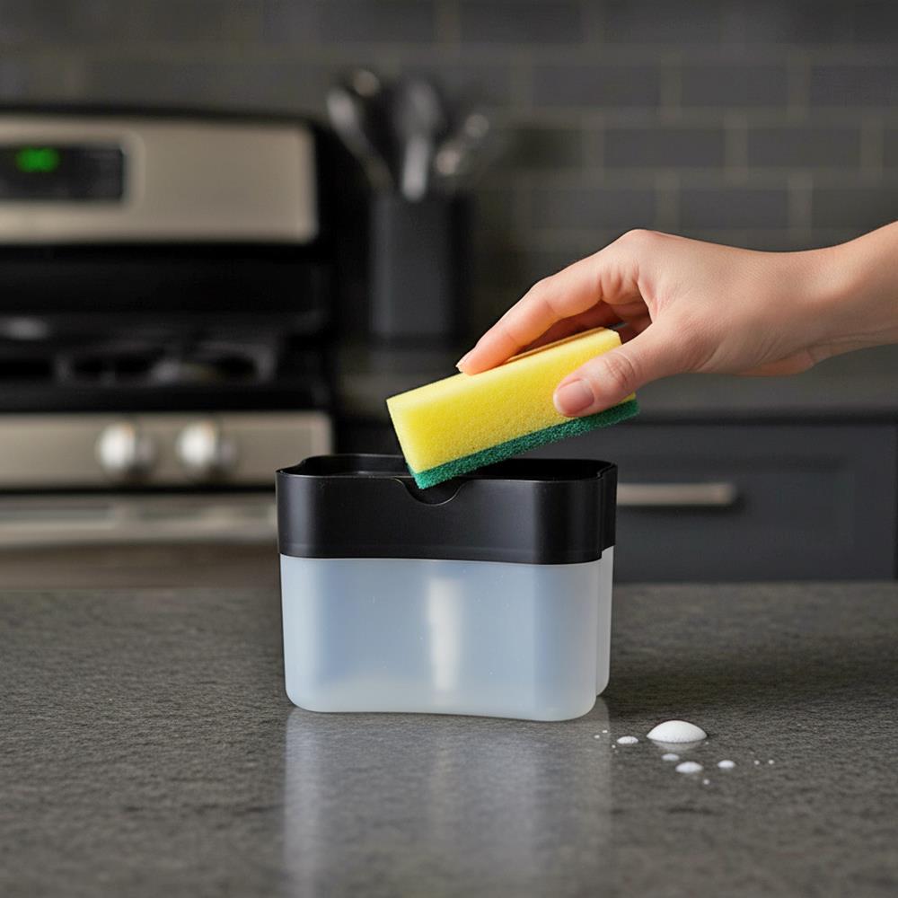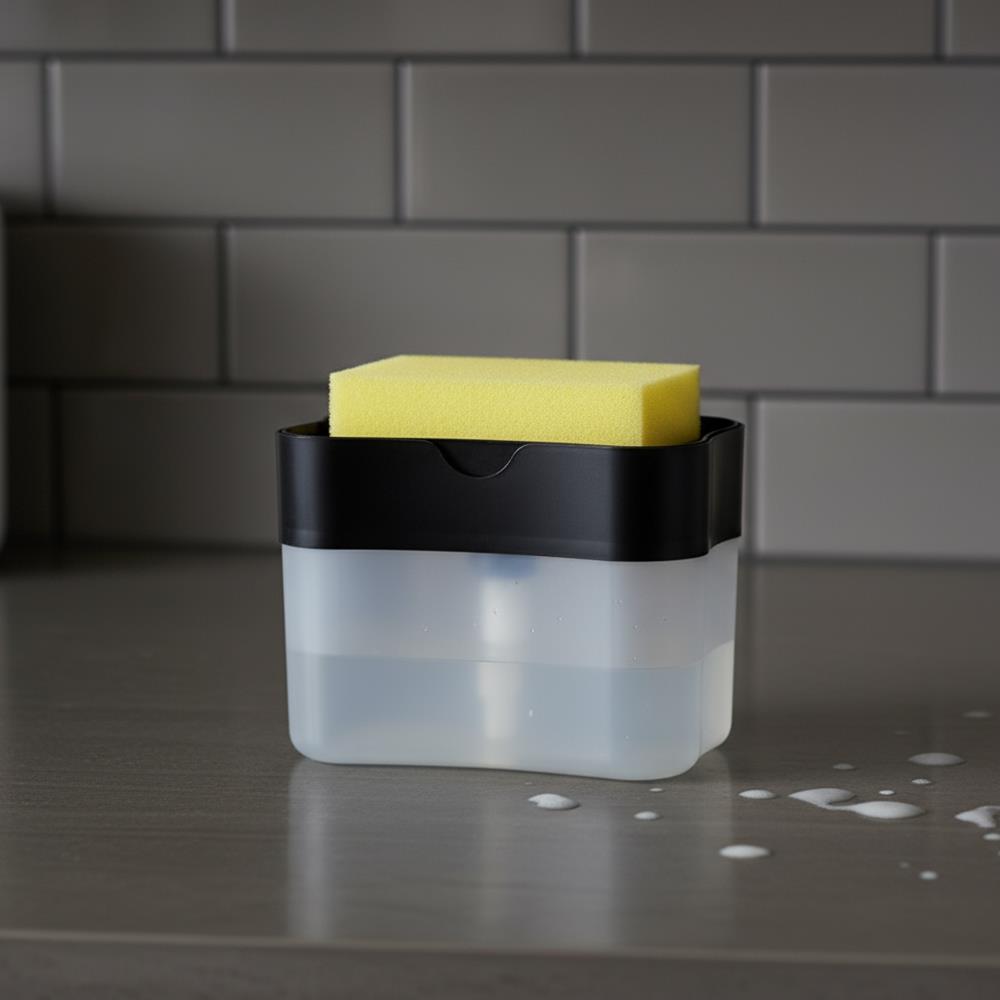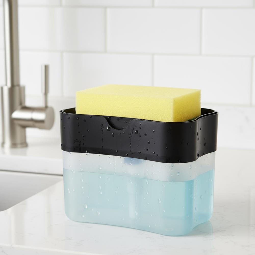 S dávkovačom saponátu nikdy nebolo umývanie riadu jednoduchšie. Je inteligentne navrhnutý tak, že saponát nebude rozliaty všade okolo drezu, ale nadávkuje vám ideálne množstvo priamo do hubky. Stačí naliať váš obľúbený saponát do dávkovača. Hubkou potom niekoľkokrát stlačte vrchnú časť dávkovača. Organizér na hubku a saponát usporiada okolie vášho drezu.