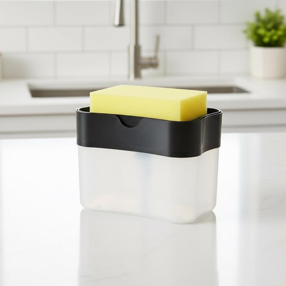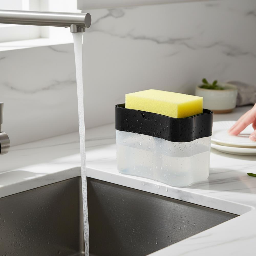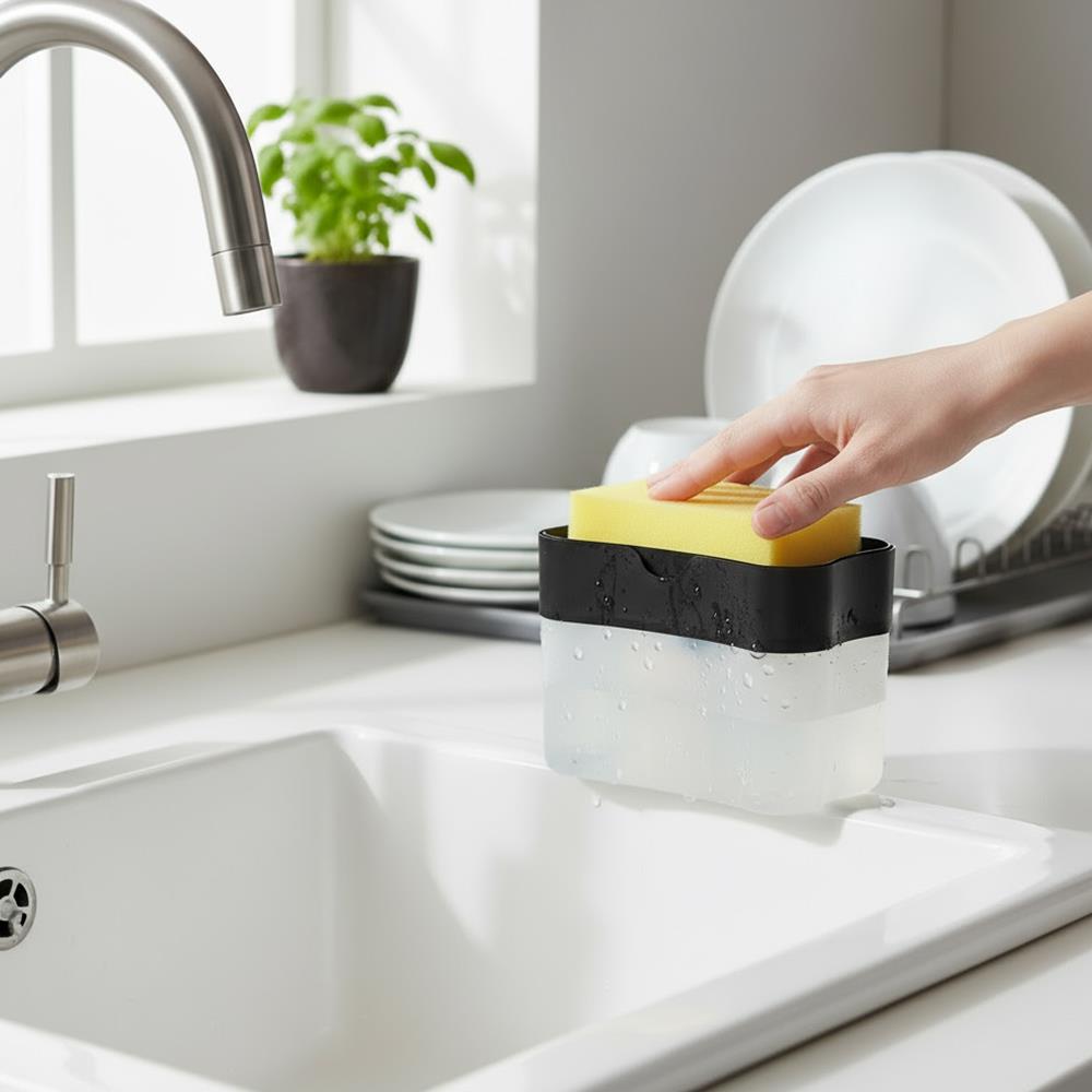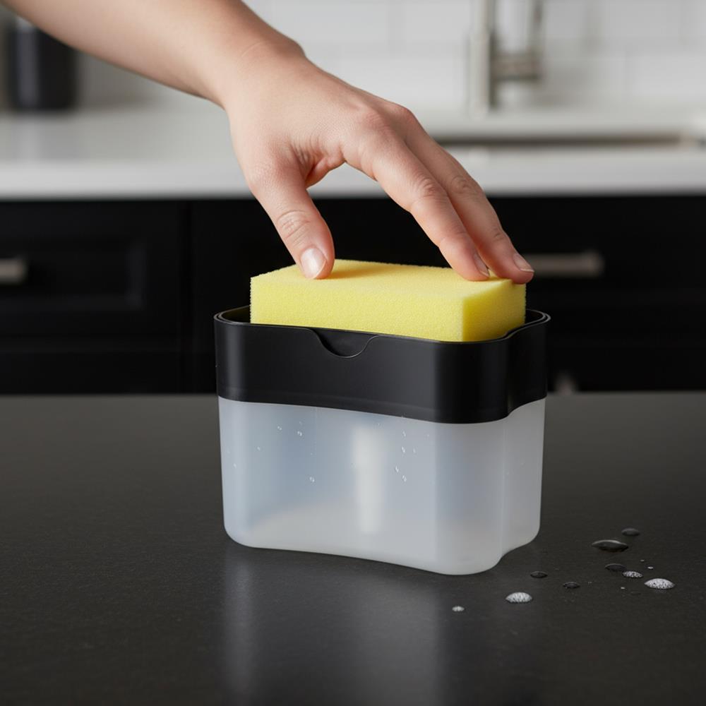 S dávkovačom saponátu nikdy nebolo umývanie riadu jednoduchšie. Je inteligentne navrhnutý tak, že saponát nebude rozliaty všade okolo drezu, ale nadávkuje vám ideálne množstvo priamo do hubky. Stačí naliať váš obľúbený saponát do dávkovača. Hubkou potom niekoľkokrát stlačte vrchnú časť dávkovača. Organizér na hubku a saponát usporiada okolie vášho drezu.