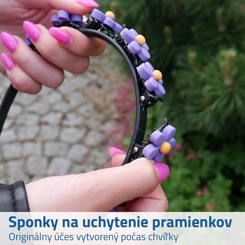 Vytvorte jedinečné a farebné účesy vďaka čelenke so sponkami! Použitie je veľmi jednoduché a vytvoriť nádherný účes tak zvládne naozaj každý. Čelenku stačí umiestniť na temeno hlavy a potom jednotlivými sponkami prevliecť pramienky vlasov. Či vytvoríte zo všetkých vlasov cop alebo z jednotlivých pramienkov drobné vrkoče, je už len na vás, fantázii sa medze nekladú!