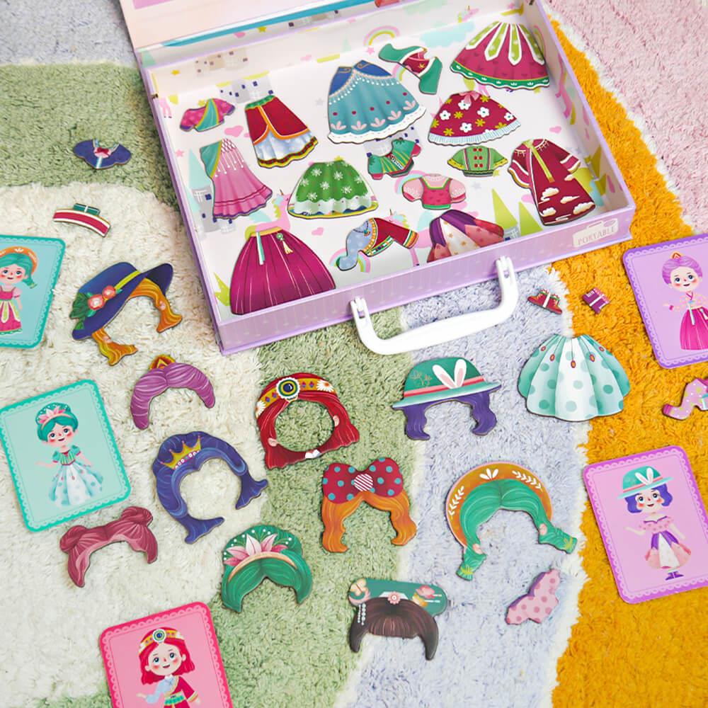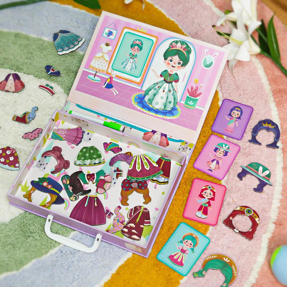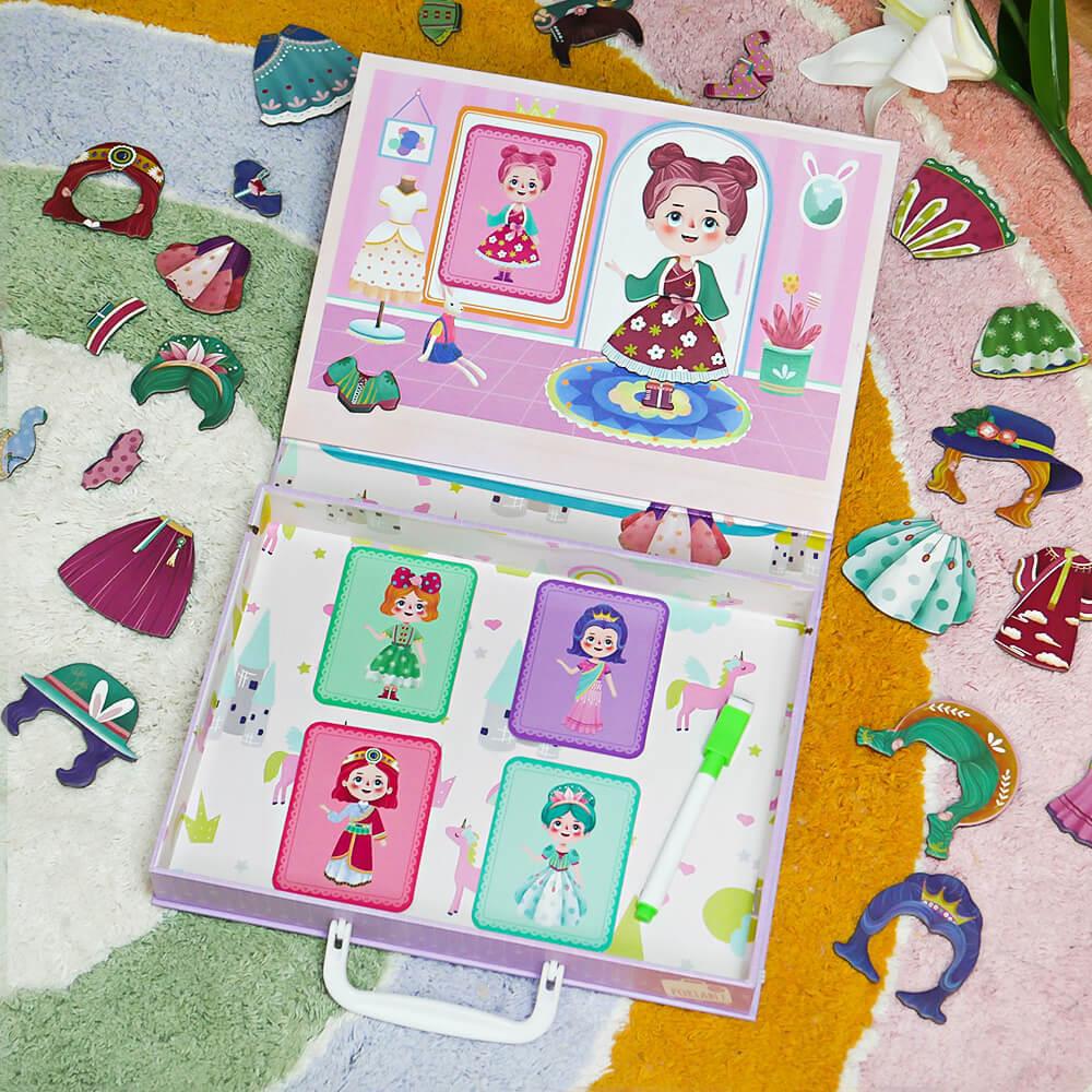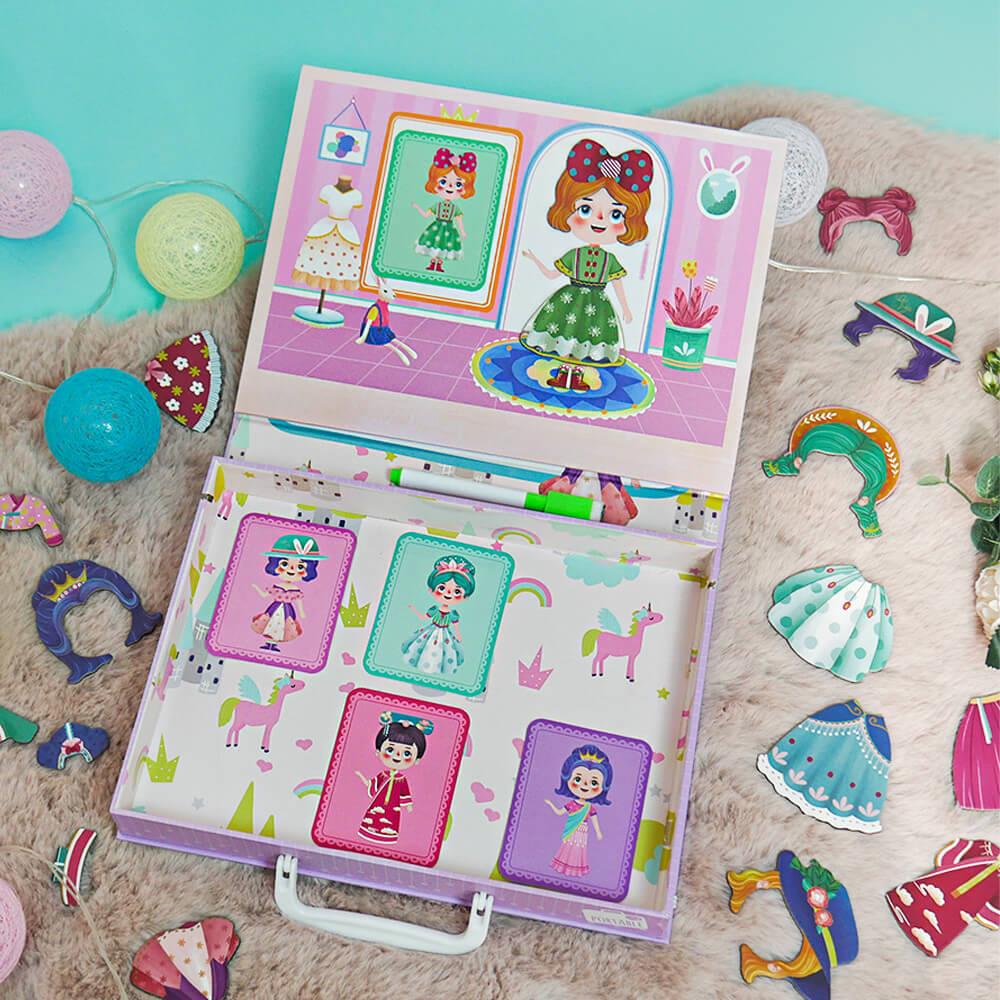 Detská magnetická hra v kufríku je ideálnou kombináciou zábavy a učenia. Na jednej strane kufríka deti čaká magnetické štúdio, kde môžu podľa predlohy alebo vlastnej fantázie obliekať bábiku do najrôznejších šiat, účesov a doplnkov. Druhá strana kufríka slúži ako kresliaca tabuľa, na ktorú môžu deti maľovať priloženým fixom. Hra tak ponúka dve aktivity v jednom, takže sa deti nikdy nenudia. Vďaka praktickému kufríku je navyše ľahko prenosná, a preto sa hodí na výlety i dlhšie cesty. Deti pri hre rozvíjajú svoju kreativitu, fantáziu i trpezlivosť. Táto hračka je ideálnym darčekom pre všetky malé návrhárky.