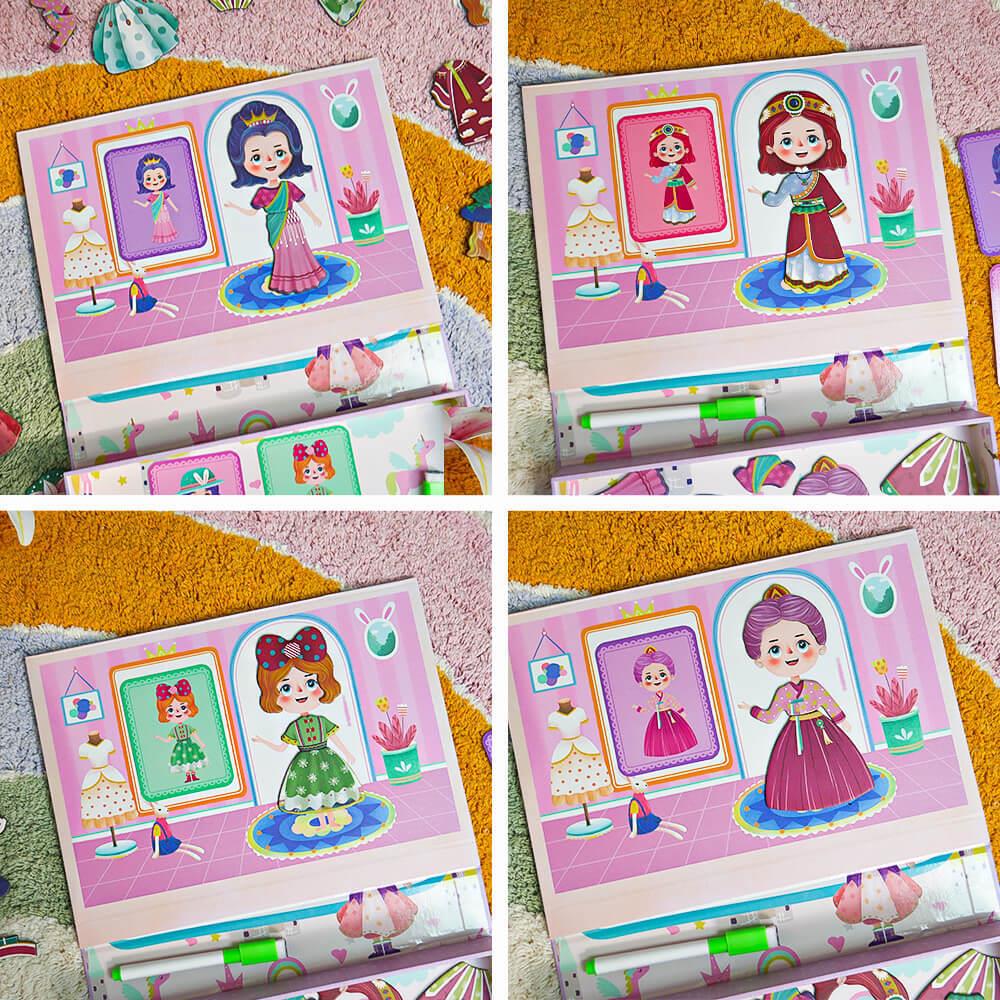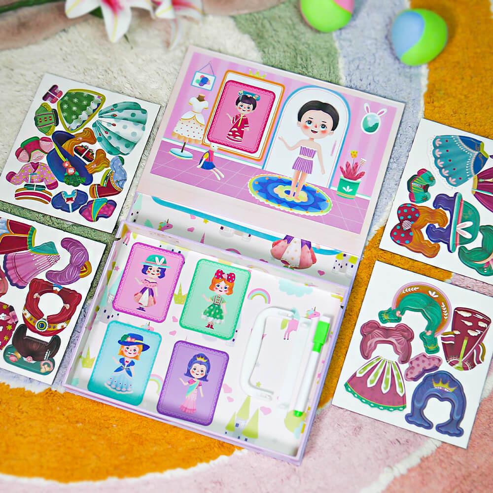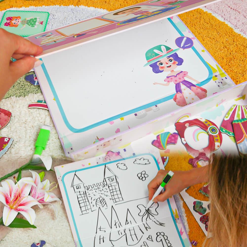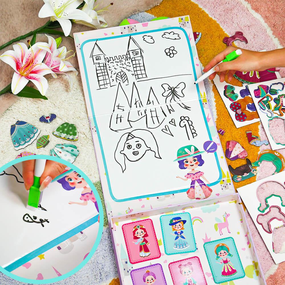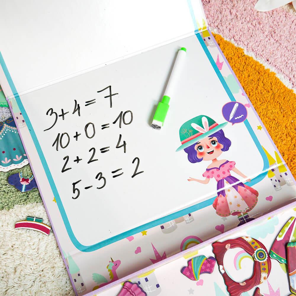 • 2v1 - Z jednej strany magnetické štúdio pre obliekanie bábik, z druhej strany kresliaca tabuľa s stierateľnou fixkou