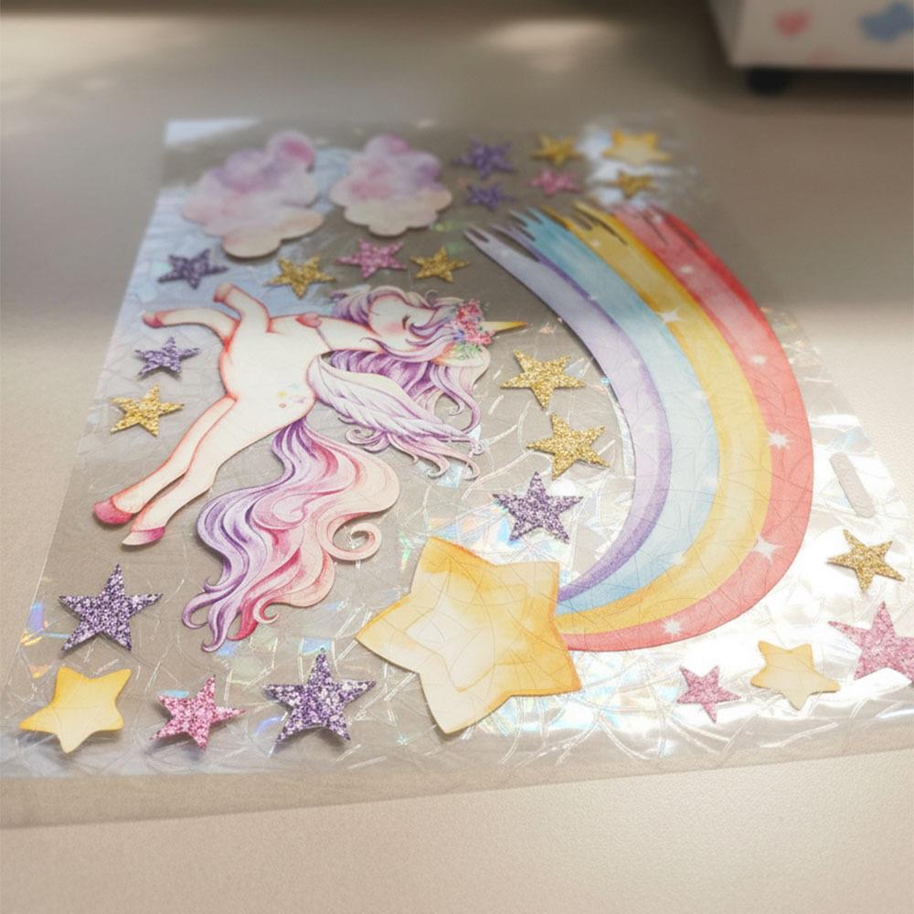Detská samolepka na okno s motívom jednorožca je čarovná dekorácia, ktorá premení obyčajné okno na farebný svet plný fantázie. Na archu nájdete roztomilého jednorožca, hviezdičky, obláčiky aj dúhu, takže si môžete vytvoriť veselú kompozíciu presne podľa seba.