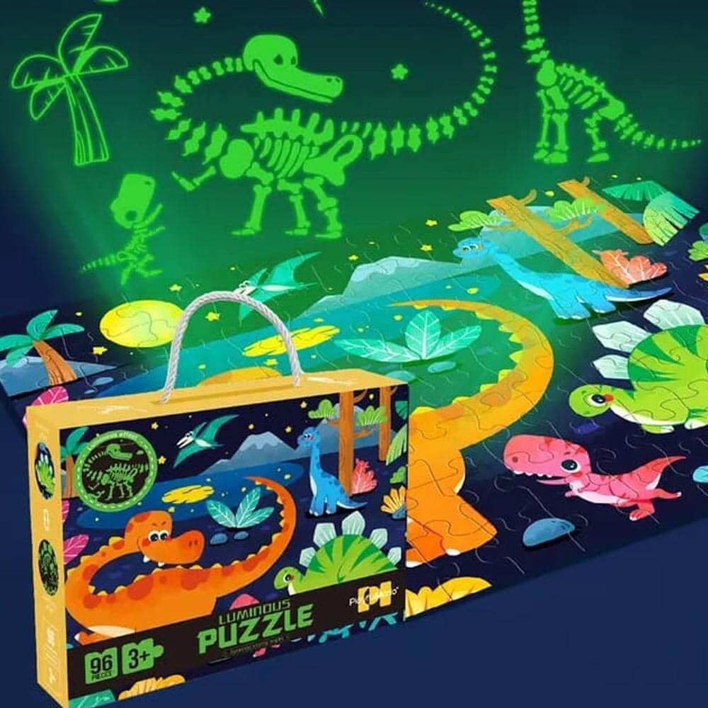 Objavte kúzlo rozprávkového sveta s detským puzzle, ktoré svieti v tme! Toto farebné puzzle s 96 dielikmi prenesie vaše deti do farebného sveta dinosaurov či princezien, a keď sa zhasne – prichádza tá pravá mágia! Časti obrázku sa rozžiaria jemným zeleným svetlom a na scénu nastupujú dinosaurove kostry alebo rozprávkové bytosti ukryté v nočnom svete.