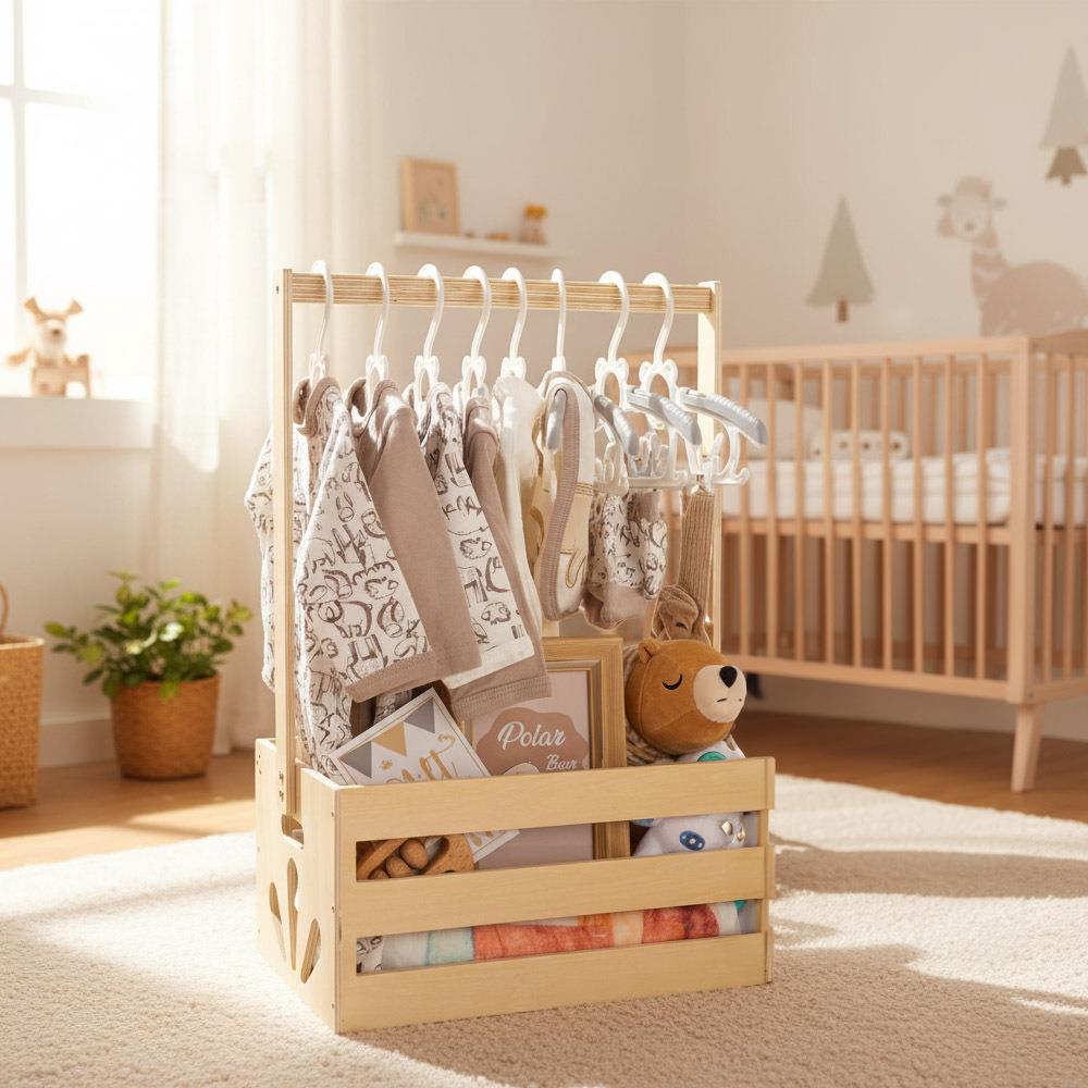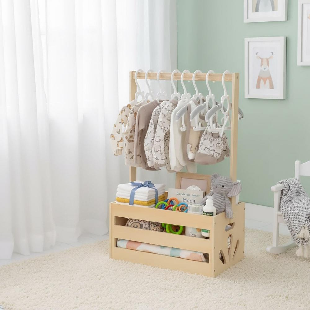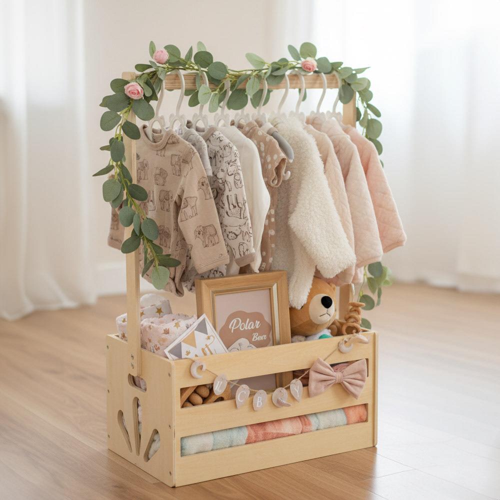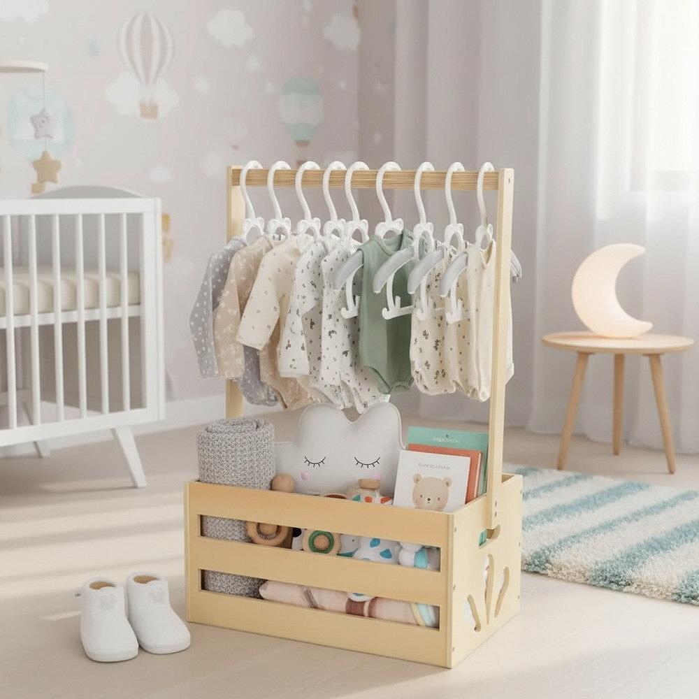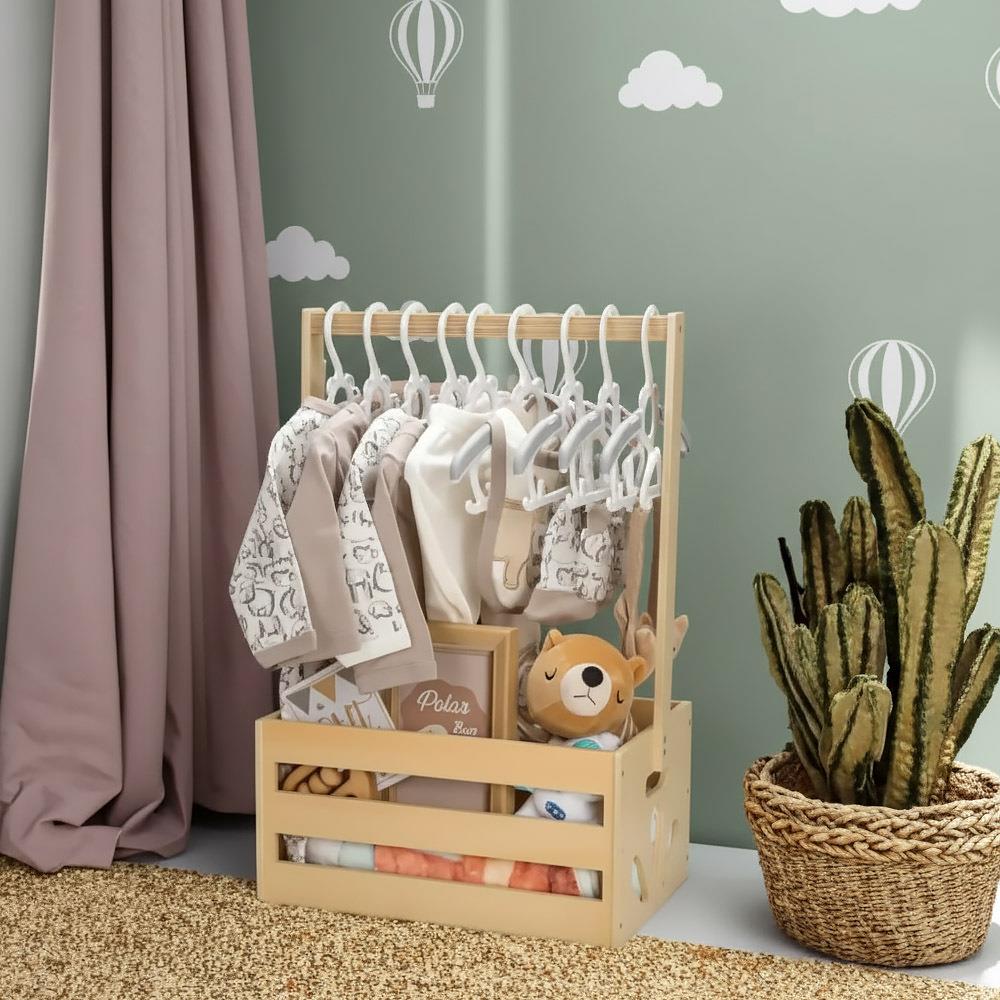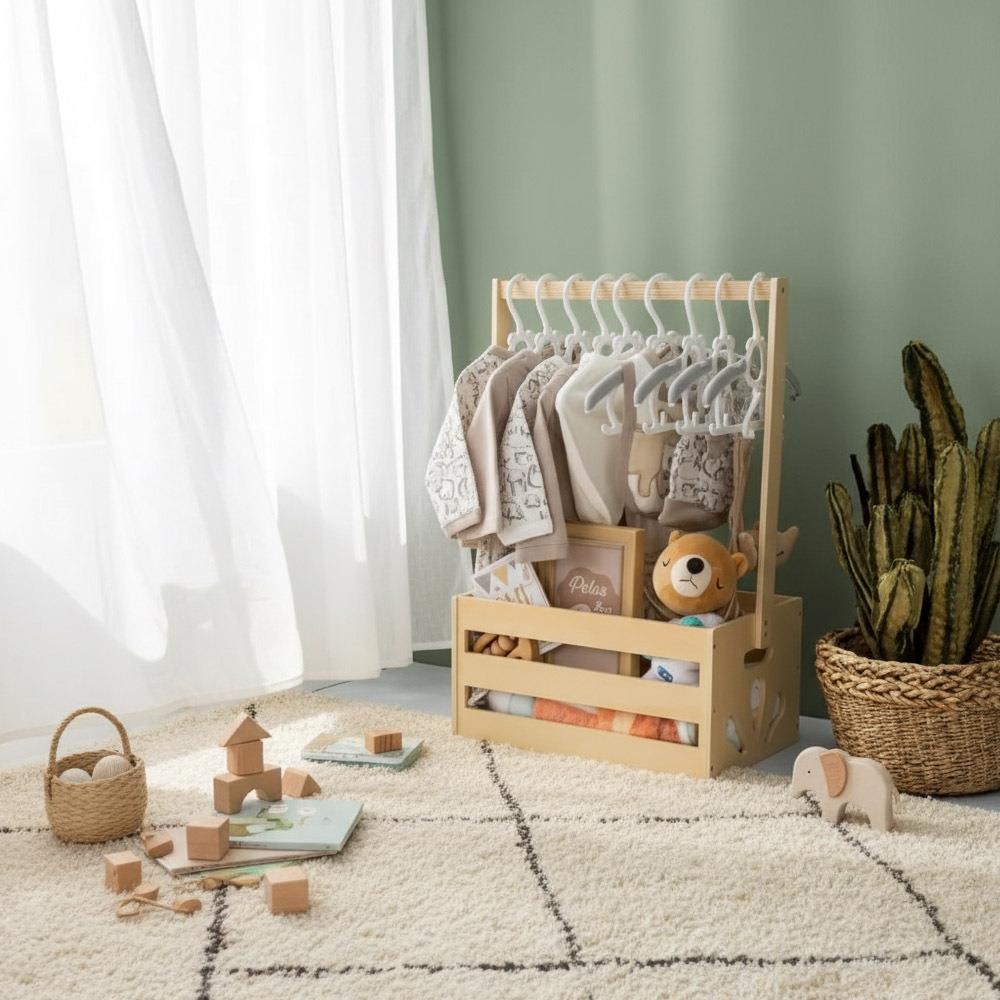 Kúzelný košíček, čo v sebe skrývaš? Predsa nevyhnutnosti pre to najčarovnejšie stvorenie, ktoré čoskoro príde na svet! Tešíte sa vy alebo vaši blízki na bábätko a premýšľate, čo zaobstarať, aby darček nielen potešil, ale bol aj praktický a ďalej využiteľný? Potom si pozrite tento nádherný košík, ktorý poslúži ako stojan na oblečenie. Najskôr ho naplňte výbavičkou a zvyšok nechajte na budúcich rodičoch – využijú ho napríklad na odkladanie vecí dennej potreby od oblečenia po hračky, ale aj na uchovávanie spomienok z prvých rokov ich drobčeka. Môže sa tak stať aj súčasťou detskej izbičky, keď sa z jedného darčeka napokon vykľuje nielen praktický úložný priestor, ale aj malé miestečko, kam si raz dieťa bude schovávať svoje poklady.