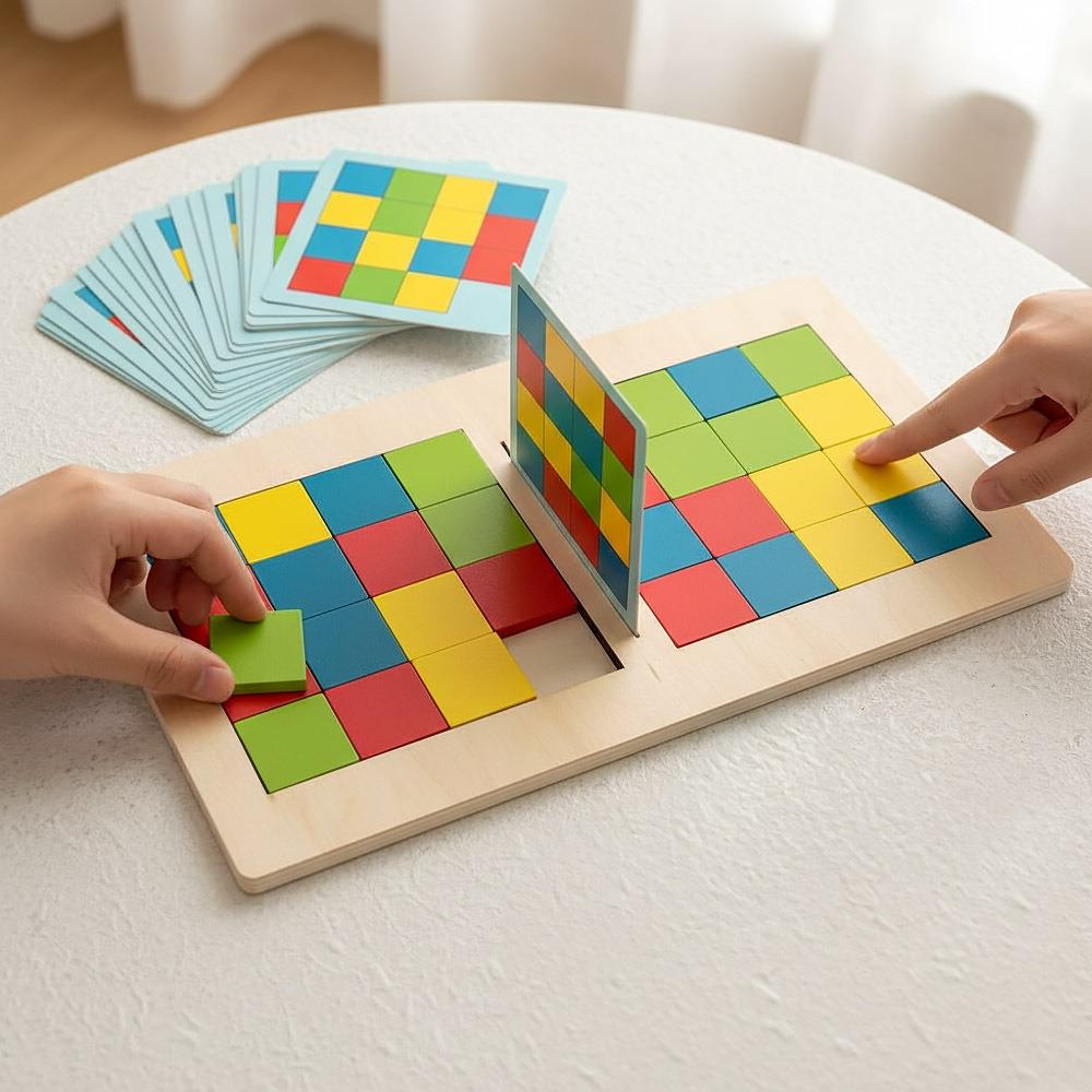 Zábavná a kreatívna drevená hra tangram pre dvoch hráčov prináša skvelú možnosť, ako rozvíjať logické myslenie a schopnosť riešiť problémy. Hráči si zvolia kartu s farebným vzorom a snažia sa čo najrýchlejšie preskupiť farebné bloky na svojej doske tak, aby zodpovedali predlohe. Rýchlosť a presnosť sú kľúčové! Vyhráva ten rýchlejší! Vďaka jednoduchému, ale chytľavému konceptu je hra vhodná pre deti aj dospelých. Pripomína Rubikovu kocku s tým, že je určená ako súťaž pre dvoch a je drevená. Práve výroba z dreva zaručuje hre dlhú životnosť a množstvo hodín zábavy. Je ideálna ako rodinná hra alebo ako súťažná zábava medzi priateľmi.