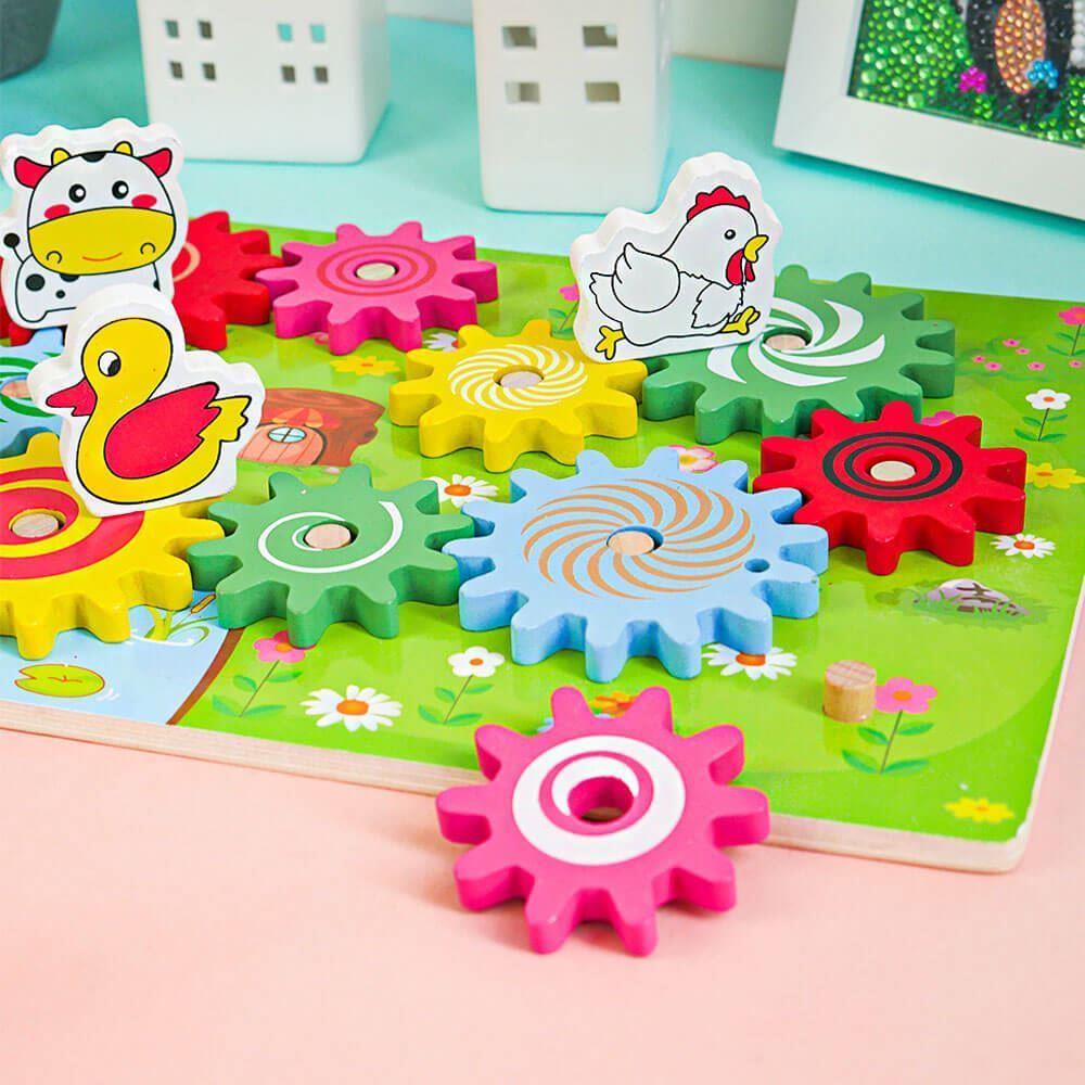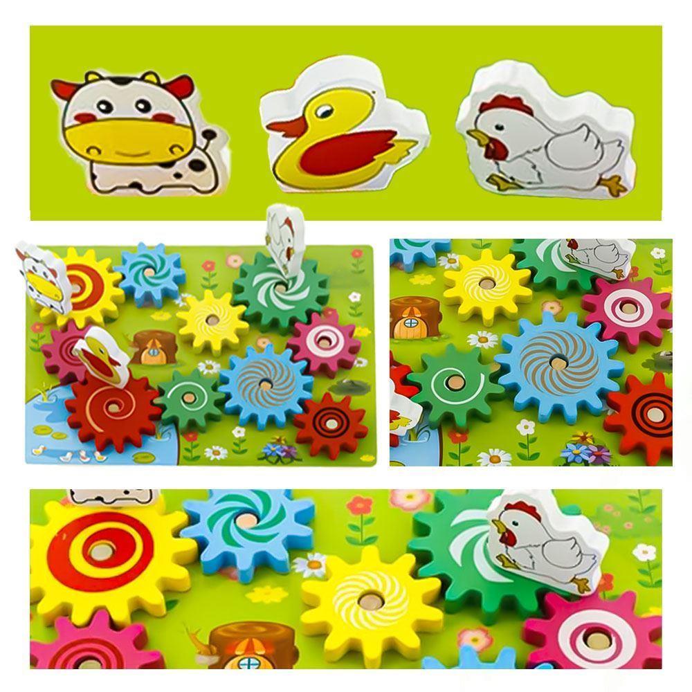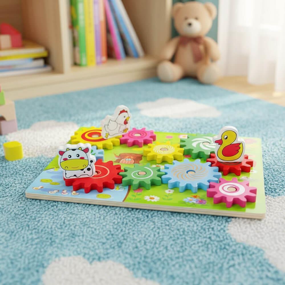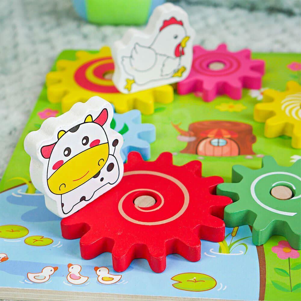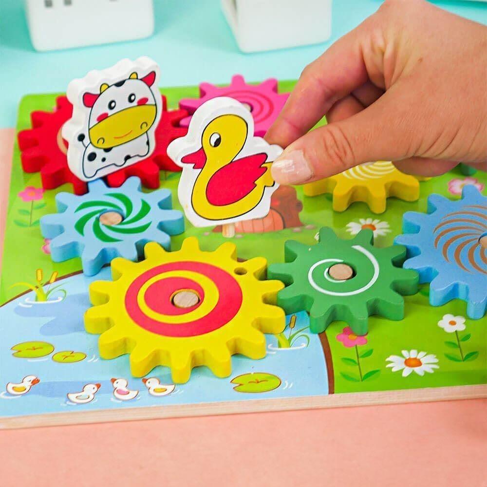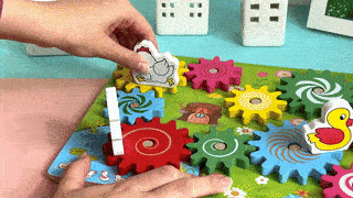 Ozubené kolesá nasadíte na dosku, a potom sa zvieratká nasadia na veľké ozubené kolesá. Ak začnete otáčať jedným zvieratkom, dá sa do pohybu koleso, na ktorom je zvieratko umiestnené, vďaka čomu sa následne začnú hýbať aj všetky ozubené kolesá v jeho blízkosti. Rôzne farebné malé aj veľké kolesá možno jednoducho premiestňovať či skladať. Vďaka tomu bude vaše dieťa rozvíjať svoje kreatívne myslenie, motoriku a zábava na deň bude jasná.