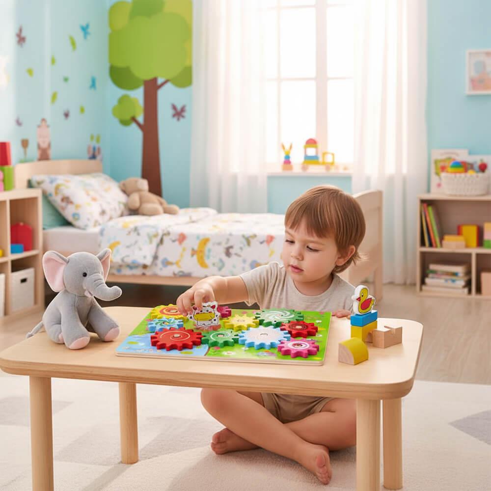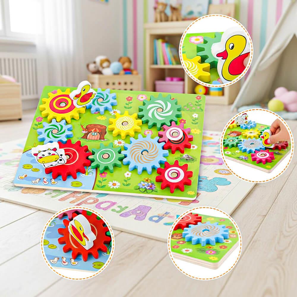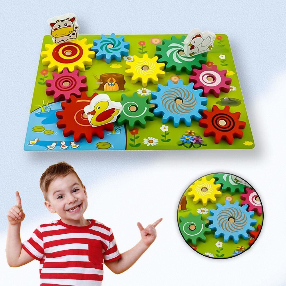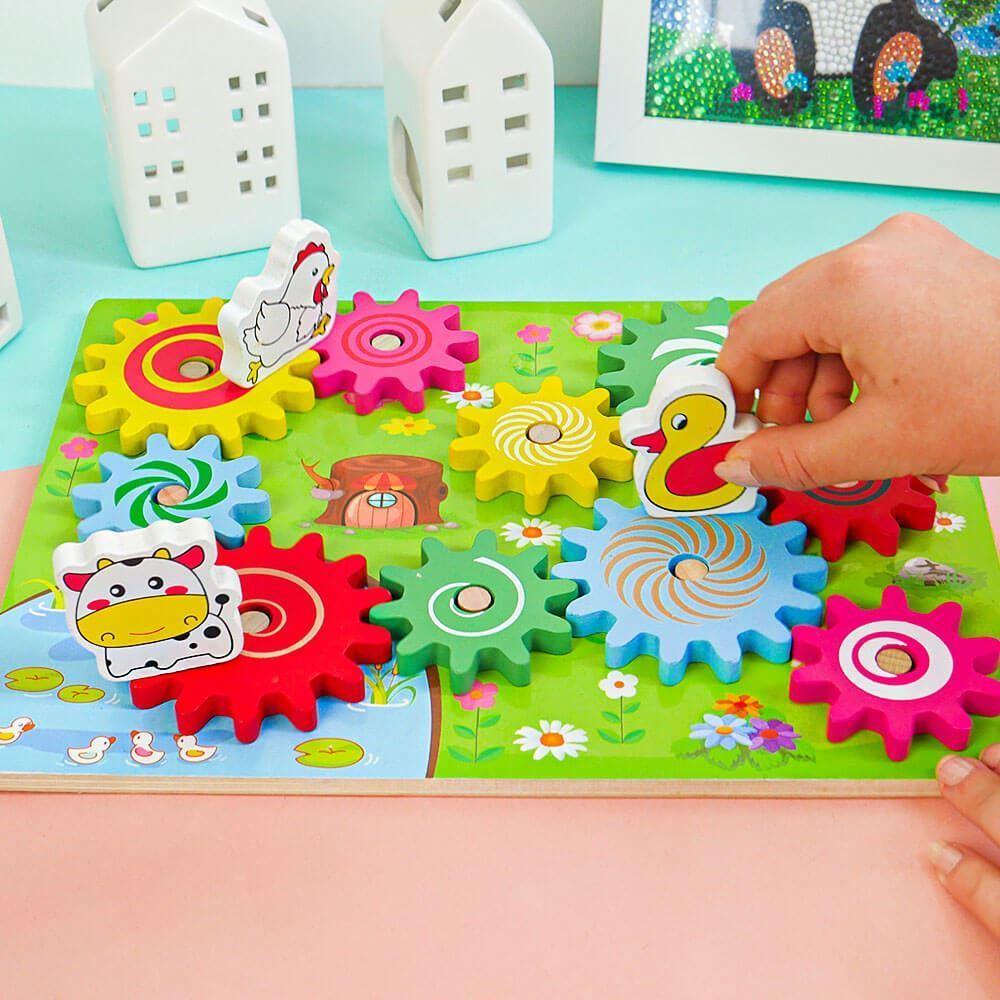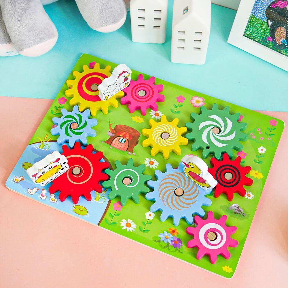 Ozubené kolesá nasadíte na dosku, a potom sa zvieratká nasadia na veľké ozubené kolesá. Ak začnete otáčať jedným zvieratkom, dá sa do pohybu koleso, na ktorom je zvieratko umiestnené, vďaka čomu sa následne začnú hýbať aj všetky ozubené kolesá v jeho blízkosti. Rôzne farebné malé aj veľké kolesá možno jednoducho premiestňovať či skladať. Vďaka tomu bude vaše dieťa rozvíjať svoje kreatívne myslenie, motoriku a zábava na deň bude jasná.