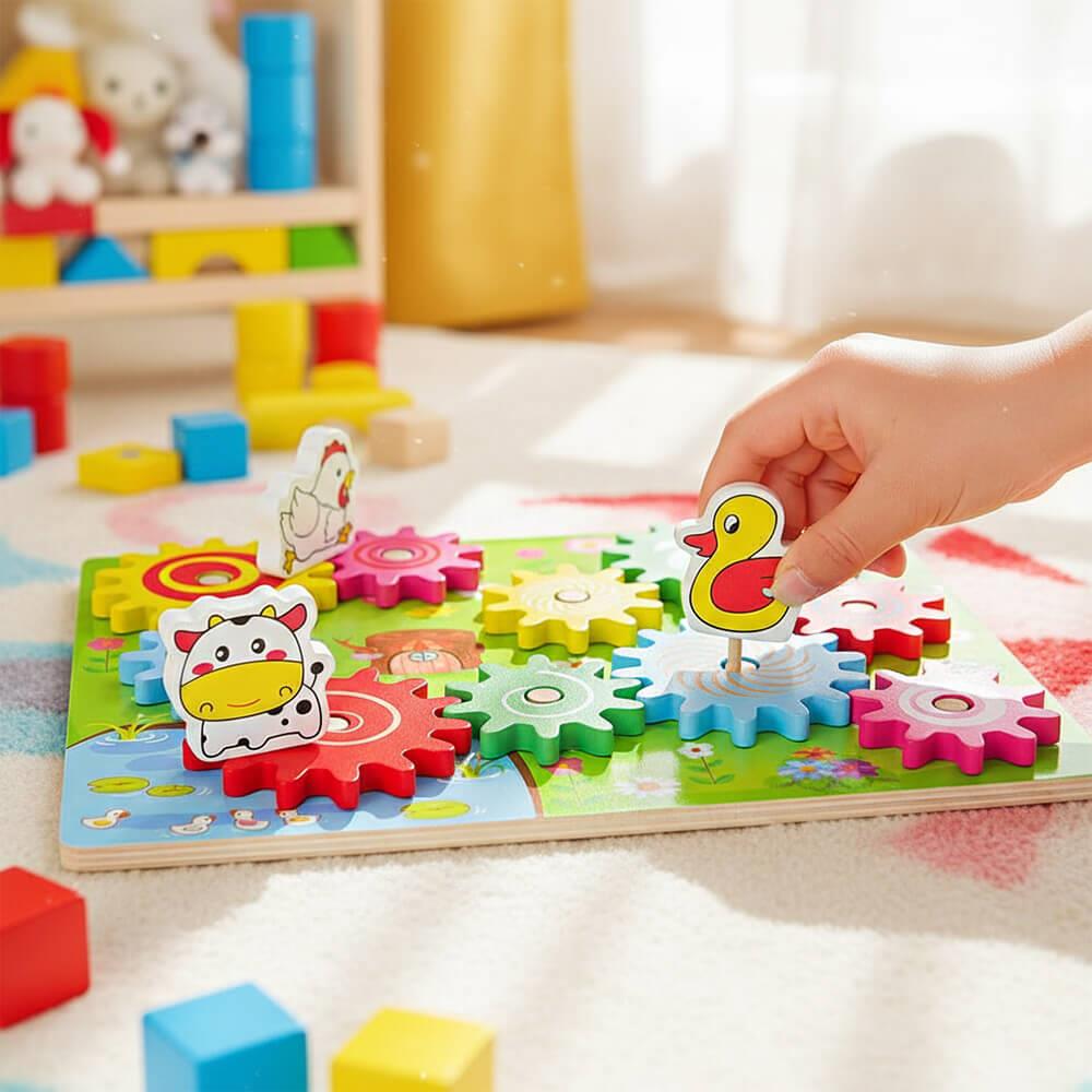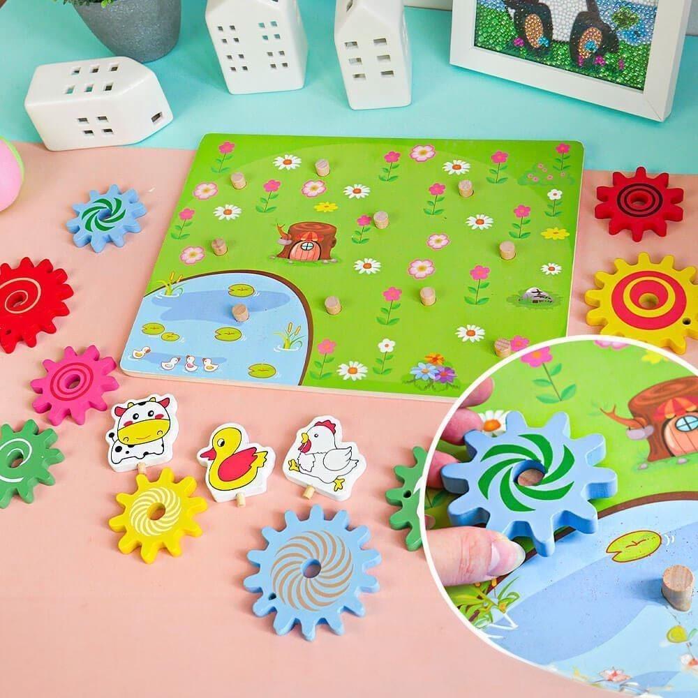 Drevená hračka so ozubenými kolieskami so zvieratkami