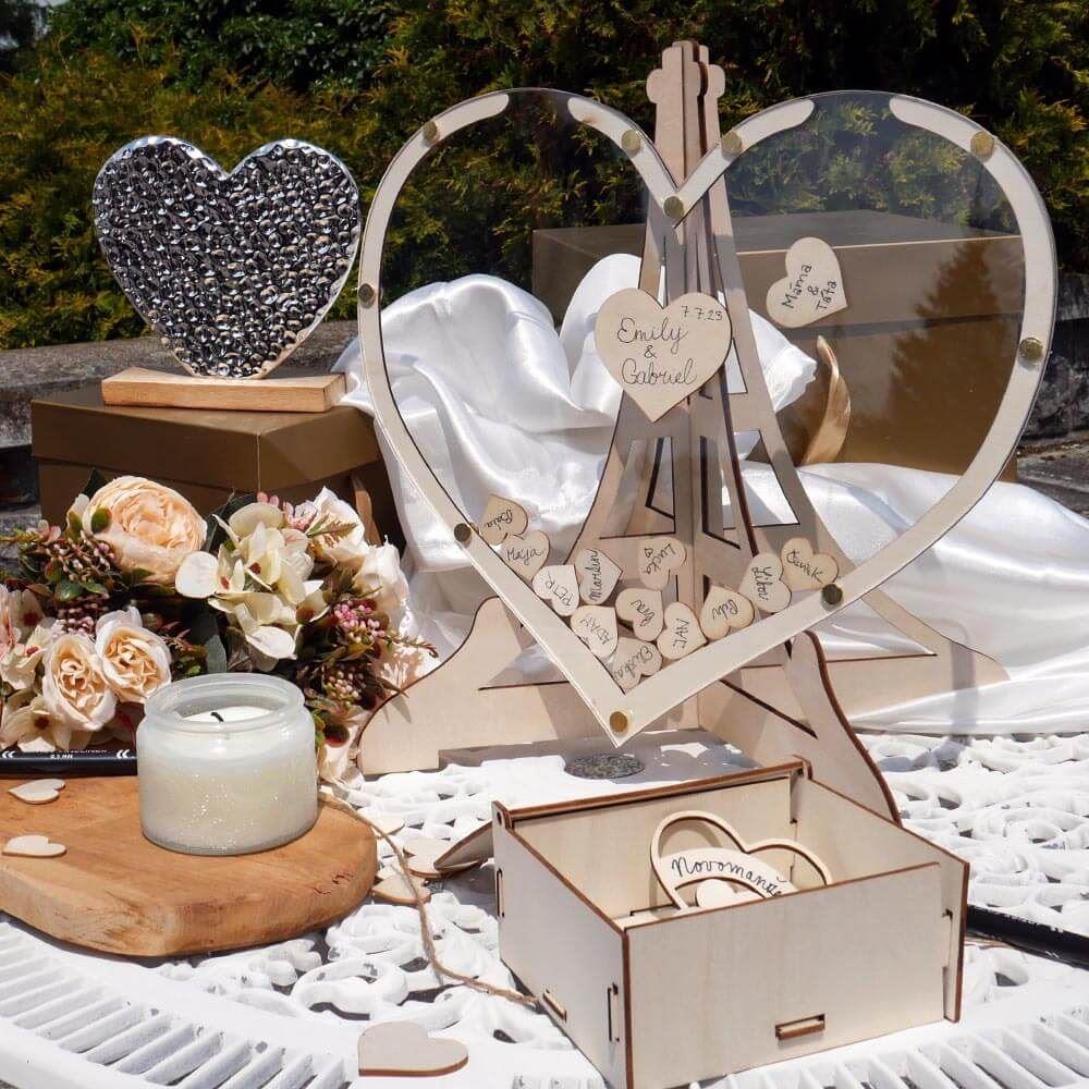 Romantické srdce ako vkusný doplnok vašej svadobnej výzdoby. Kniha hostí v tvare srdca bude na vašej svadbe stredobodom pozornosti. Uprostred veľkého srdca je priestor na napísanie mien novomanželov a dátum svadby. Nechajte si napísať niečo pekné na malé drevené srdiečko od svojich blízkych.