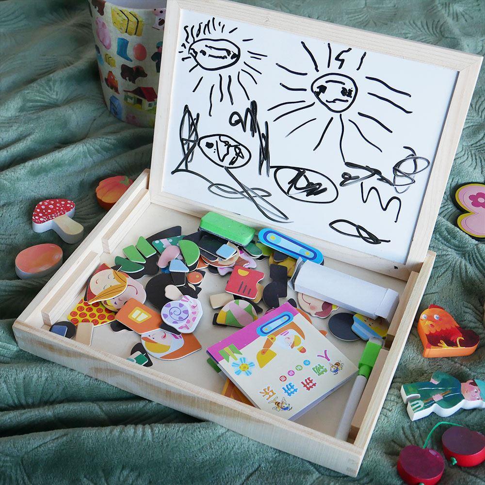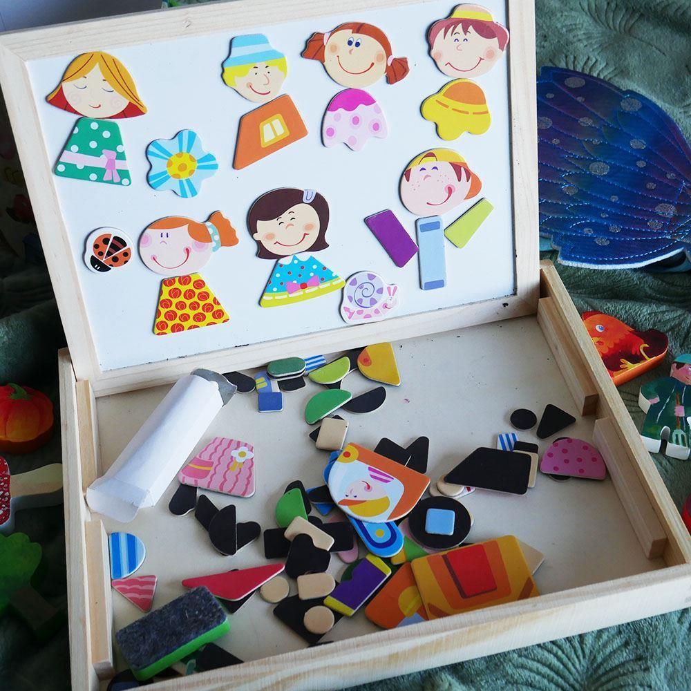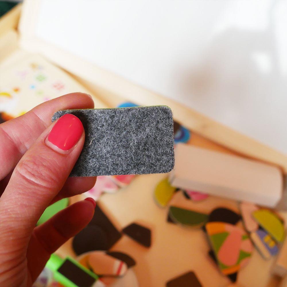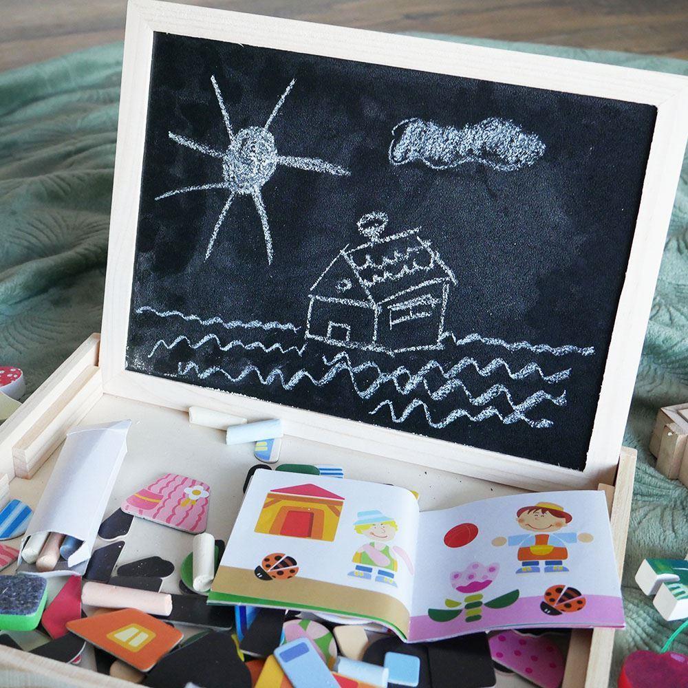 Rozkladací detská tabuľka. Obsahom balenia je sada magnetiek s detskými motívmi. Deti si môžu skladať rôzne obrázky a s nimi potom vymýšľať rôzne príbehy. Navyše je možné tabuľku jednoducho rozkladať a znovu skladať. Obsahom balenia je všetko dôležité. Nájdete tam kriedy, špeciálnu fixku, hubku a sadu magnetiek s rôznymi detskými motívmi.
