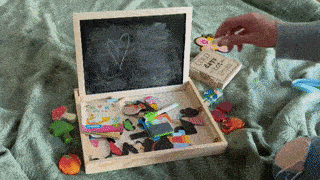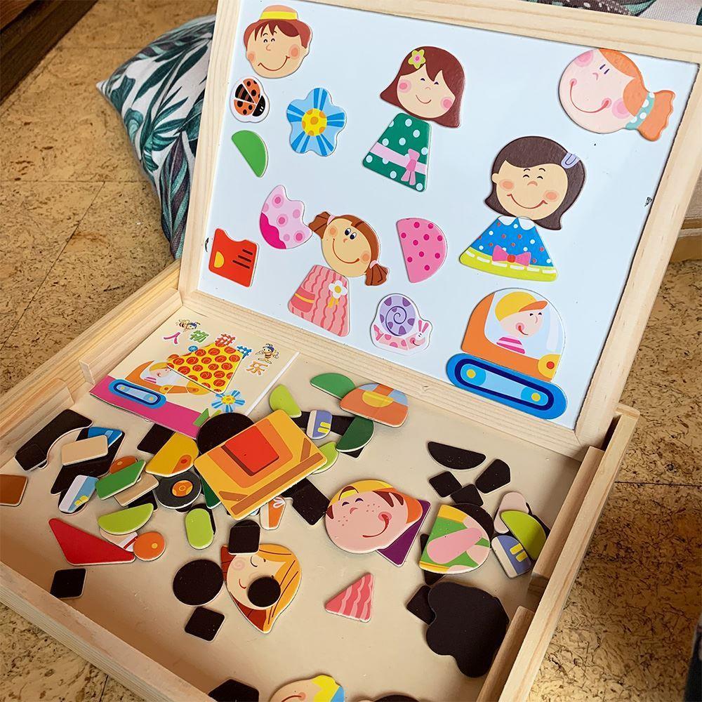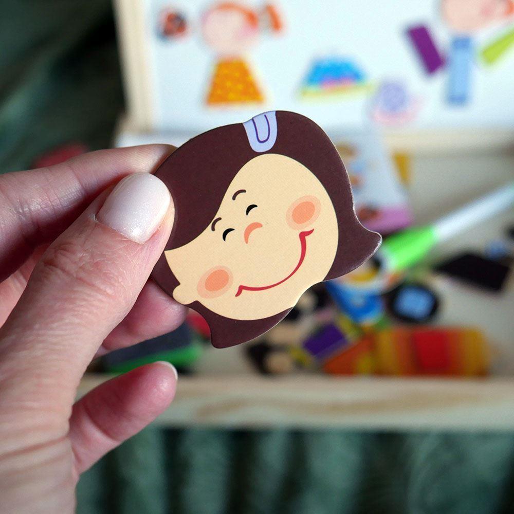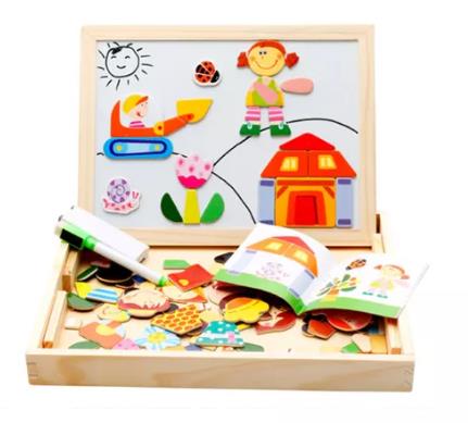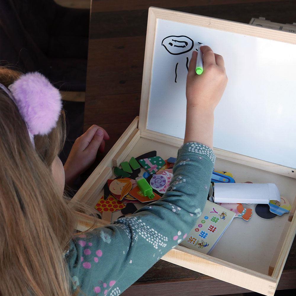 Rozkladací detská tabuľka. Obsahom balenia je sada magnetiek s detskými motívmi. Deti si môžu skladať rôzne obrázky a s nimi potom vymýšľať rôzne príbehy. Navyše je možné tabuľku jednoducho rozkladať a znovu skladať. Obsahom balenia je všetko dôležité. Nájdete tam kriedy, špeciálnu fixku, hubku a sadu magnetiek s rôznymi detskými motívmi.