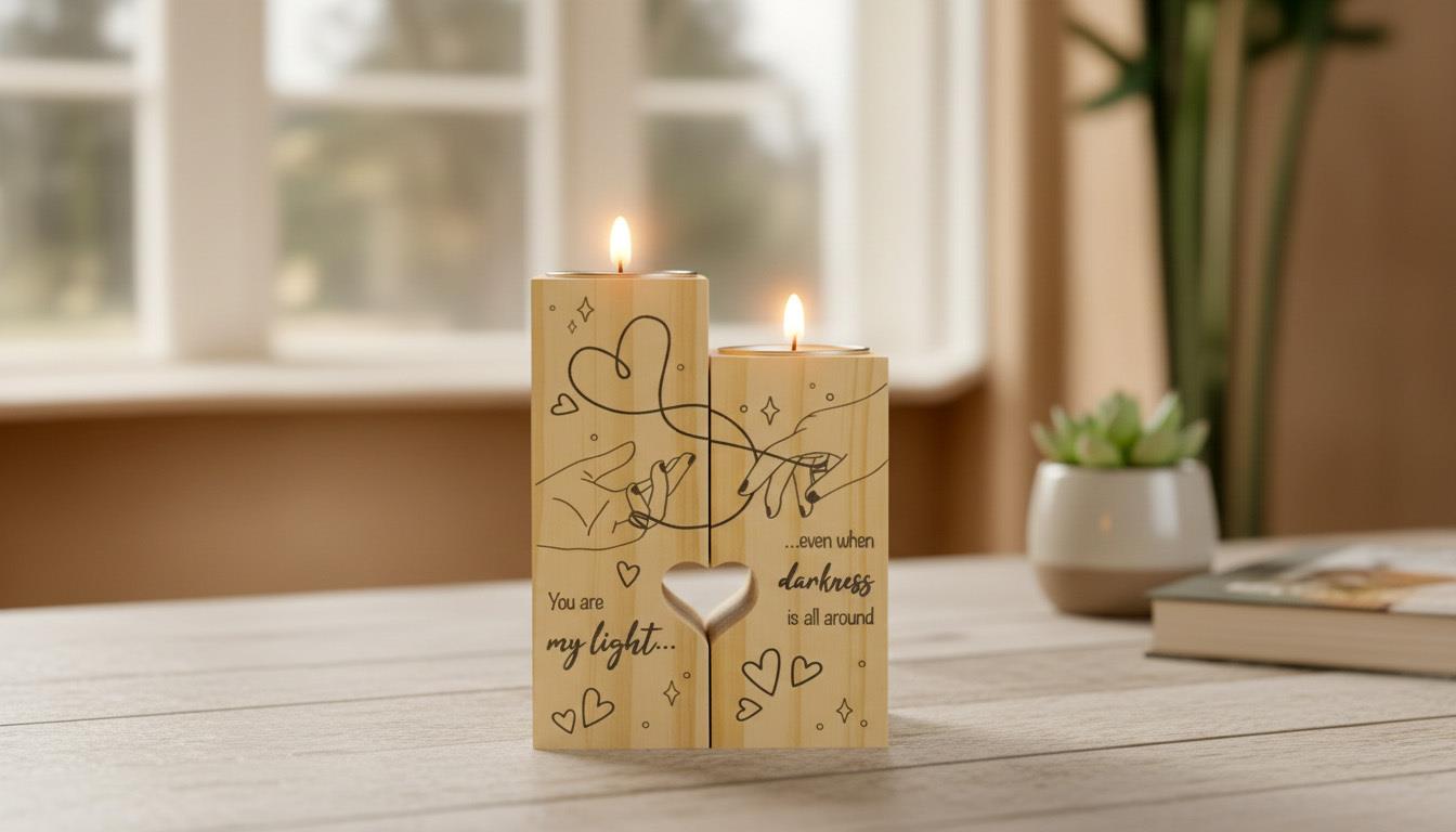 Tieto drevené svietniky na čajové sviečky pre páry nie sú len dekoráciou, ale predovšetkým nositeľom emócií. Každý set obsahuje dva svietniky rôznej výšky, ktoré k sebe patria – rovnako ako dvaja ľudia, ktorých spája láska, priateľstvo a hlboké puto.