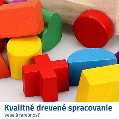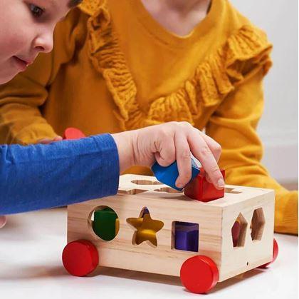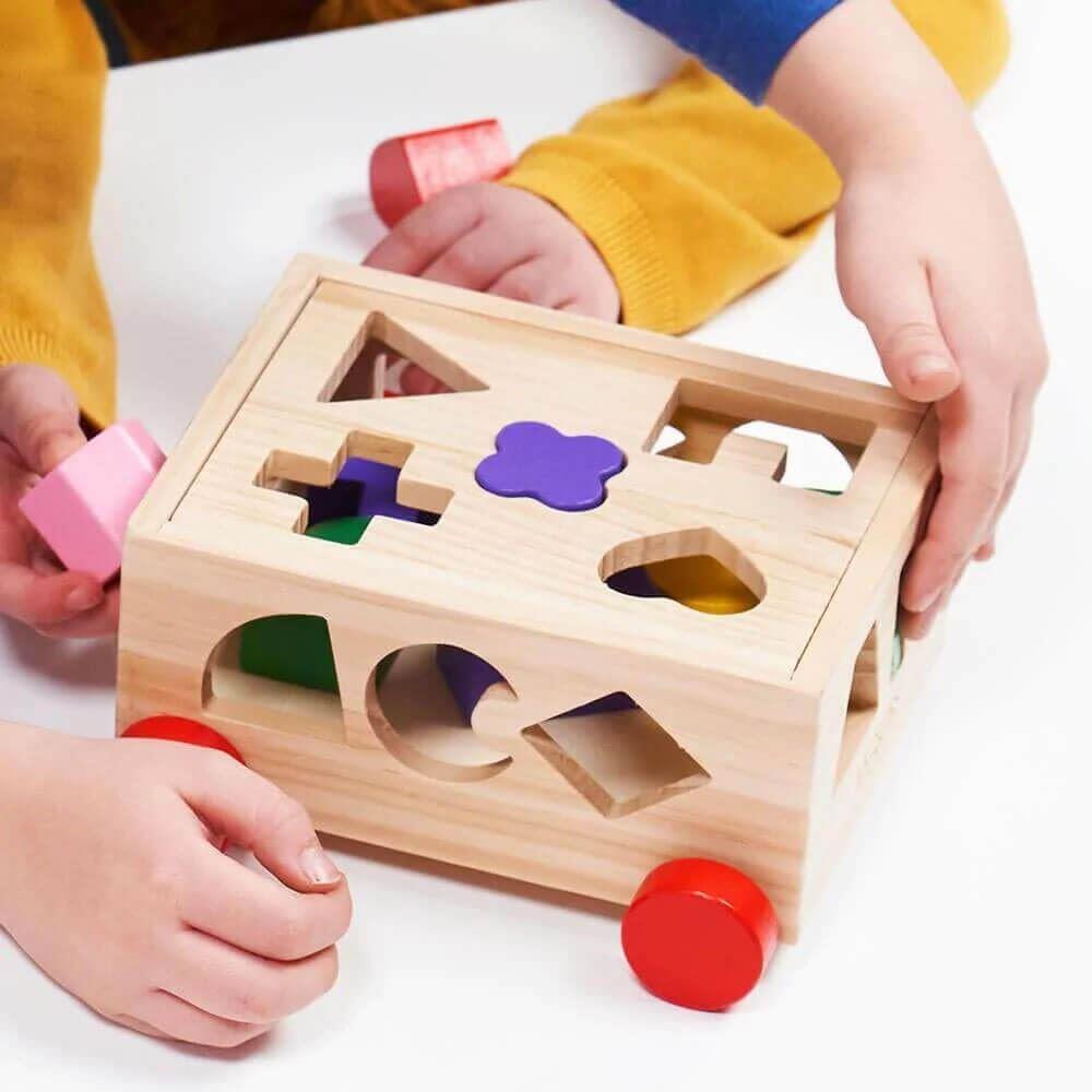 Hranie s vozíkom a tvarmi rozvíja predovšetkým jemnú motoriku. Deti si osahajú najrôznejšie tvary a vďaka snahe trafiť sa do otvoru vo vozíku navyše potrénujú koordináciu oko – ruka. Zároveň spoznajú rôzne tvary a farby, ktoré si s nimi počas hrania môžete precvičovať. Drevený vozík má kolieska a šnúrku, za ktorou možno vozík ťahať za sebou.