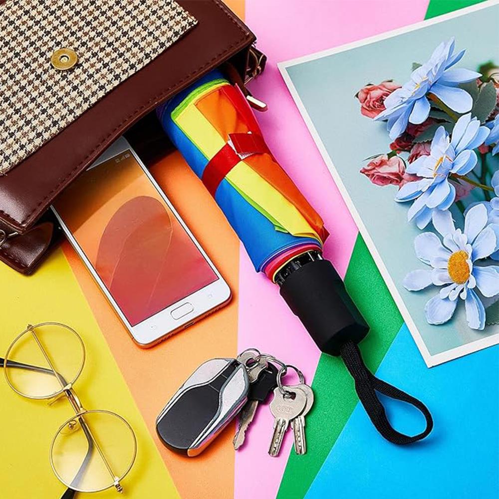 S dúhovým skladacím dáždnikom už žiadny dážď nebude nepríjemný! Jeho veselý farebný dizajn prináša radosť a optimizmus aj do najpochmúrnejších dní. Vďaka praktickému skladaciemu prevedeniu sa ľahko zmestí do kabelky alebo batohu, takže ho môžete mať stále po ruke.
