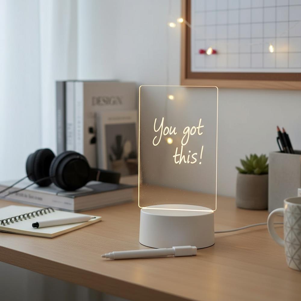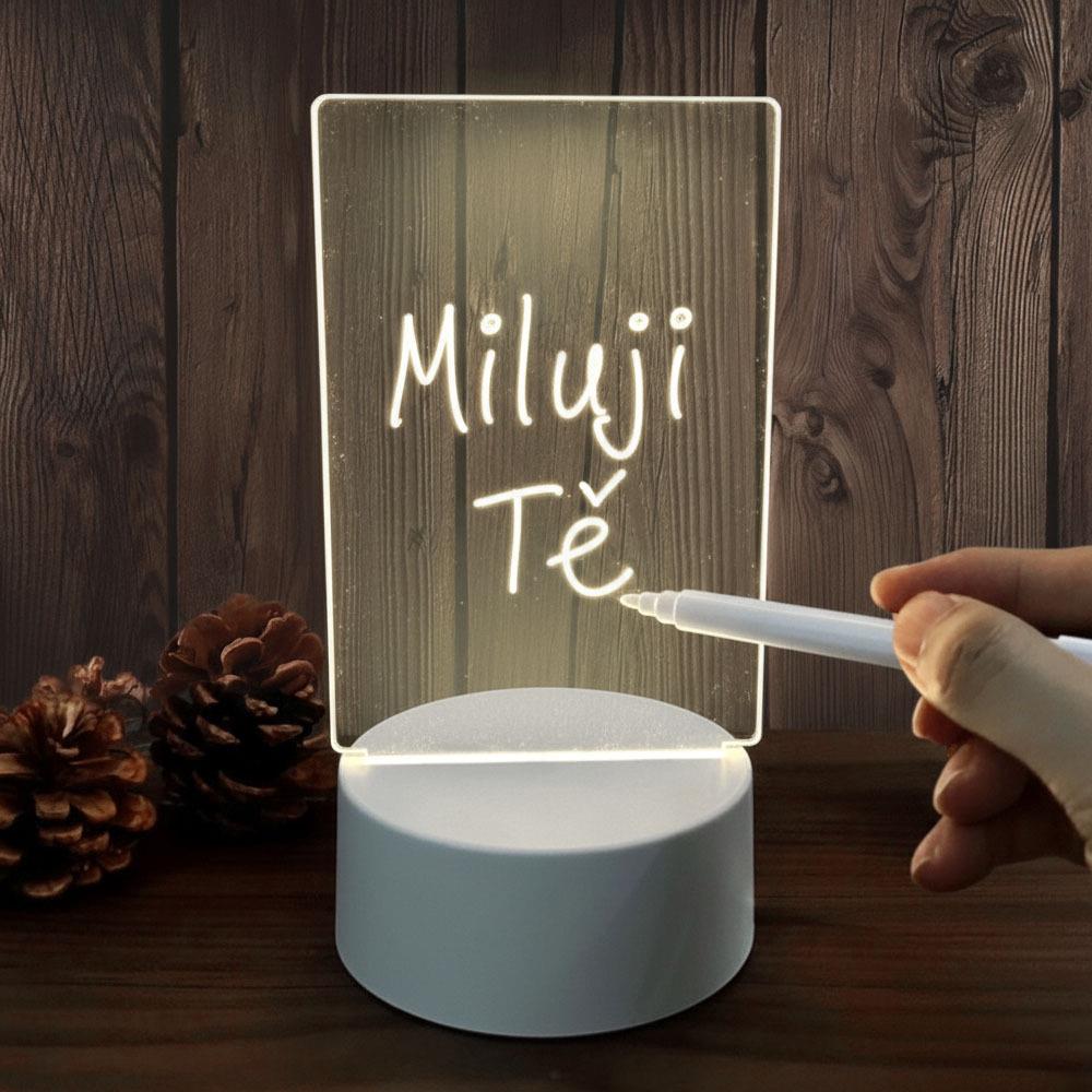 Dobré ráno, dobrú noc, nezabudni na to a to – keď je v domácnosti ruch, často sa spoliehame na drobné odkazy, aby sme odovzdali informácie našim blízkym, ktorým kvôli zaneprázdneniu občas chceme či nechceme niečo zanedbať. Obyčajné lístočky alebo nápisy na chladničke však nielenže občas zmiznú, ale rozhodne nemajú také čaro ako táto originálna stolová lampička, ktorá váš odkaz doručí za žiary svojho svetla a zároveň poteší. Skvele sa hodí na nočný stolík, kde s ňou zaželáte pekné sny, ale aj na pracovný stôl, aby ste už nezabudli na dôležité úlohy. Vezmite do ruky priložený fix a napíšte všetko, čo máte na srdci. Hneď ako sa lampička rozsvieti, informácia sa odovzdá ďalej, a keď bude treba odpovedať, handričkou pôvodný text zmažete a napíšete nový odkaz. S lampičkou tak získate spoločníka, s ktorého pomocou nielen niečo poviete, ale aj vaša správa sa nestratí – či už fyzicky, alebo v mysli príjemcu.