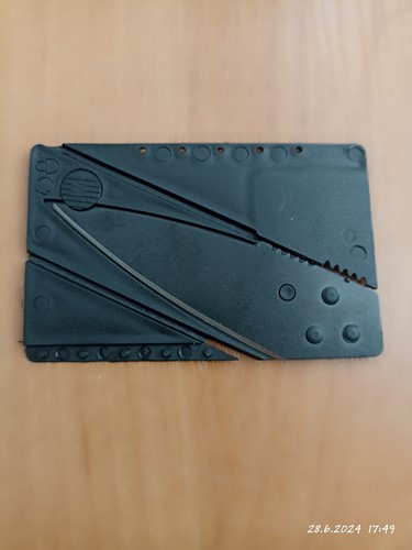 Užásná věcička. Vejde se do peněženky jako nic, vypadá jako kreditka - nenápadné. Lehce se složí. 3 přehnutí a máte nožík :). Leccos vydrží, opravdu ostrý, vhodný na cokoli a kamkoli.