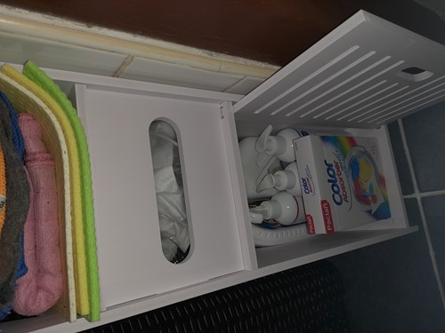 Skrinka ponúka otvorené police pre rýchly prístup k denne používaným veciam, ako sú kozmetika, uteráky alebo čistiace prostriedky. Vstavaný držiak na toaletný papier a uzatvárateľná skrinka umožňujú diskrétne uloženie hygienických potrieb.