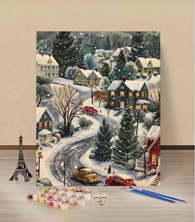 Maľovanie podľa čísel, napnuté plátno na rám - zimná dedina