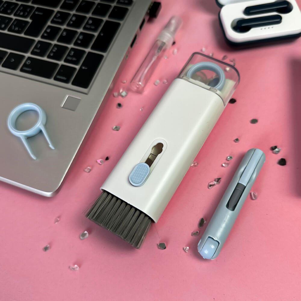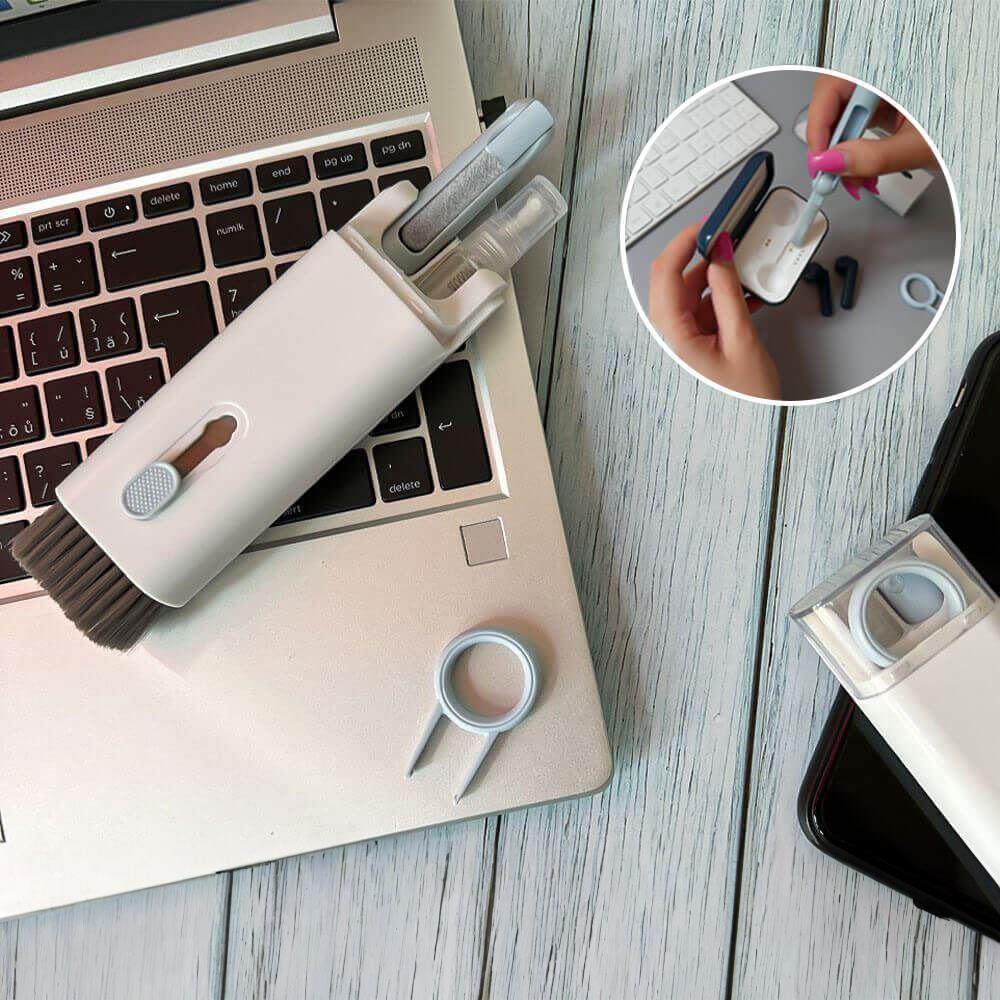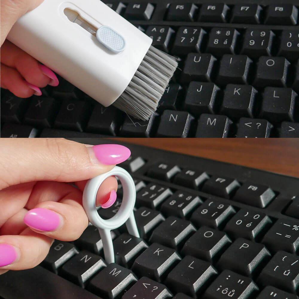 V multifunkčnej sade nájdete kefku na klávesnicu, čistič displeja, nádobku na vodu, pomôcku na sňatie tlačidiel z klávesnice a tri kefky – jednu na čistenie úložného priestoru slúchadiel, druhú na čistenie špuntov v slúchadlách a poslednú na čistenie povrchu slúchadiel, takže všetko potrebné pre čistotu vašich zariadení máte v jednom.