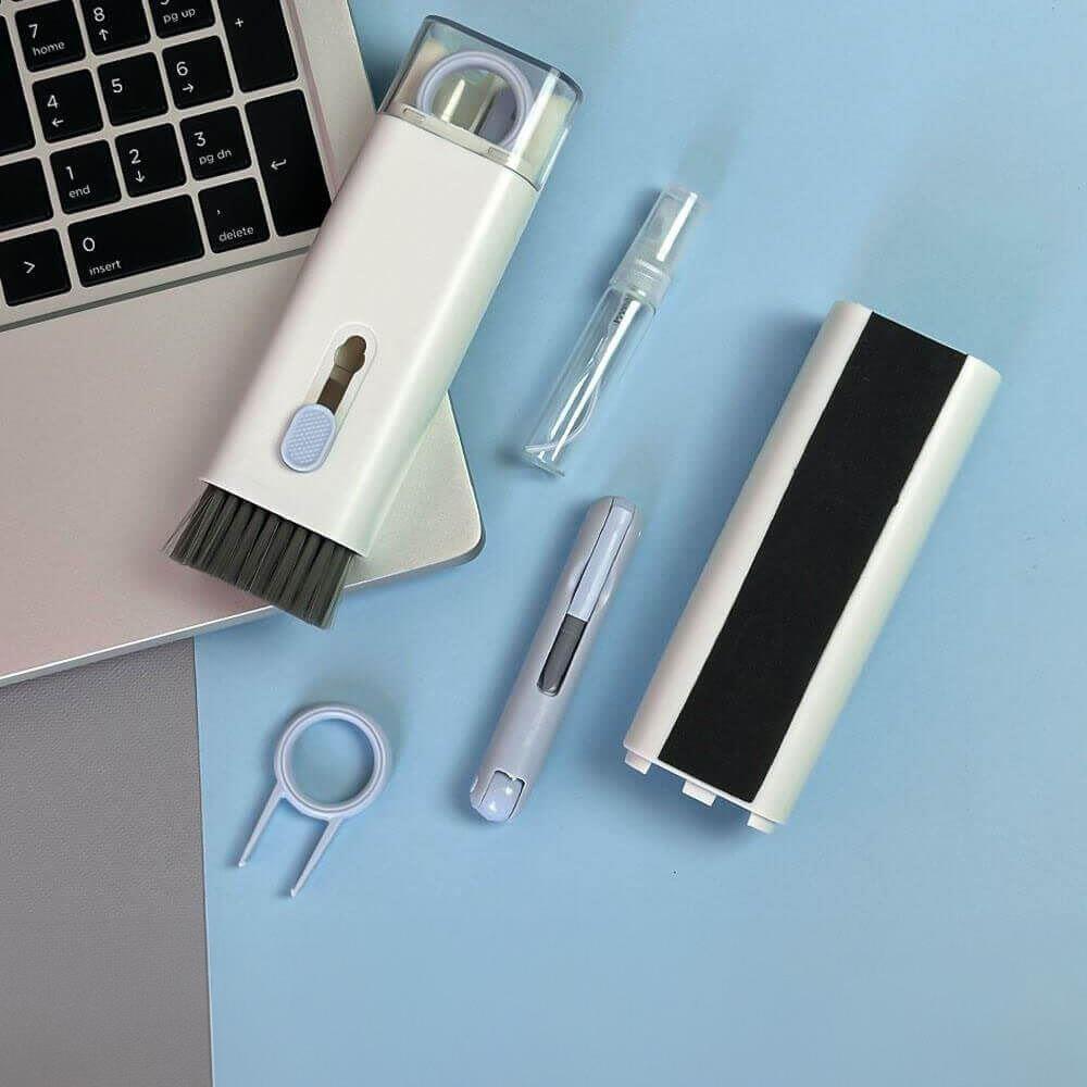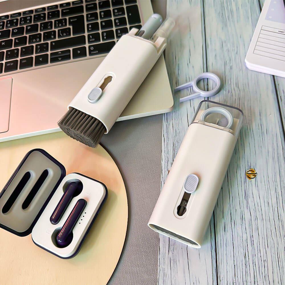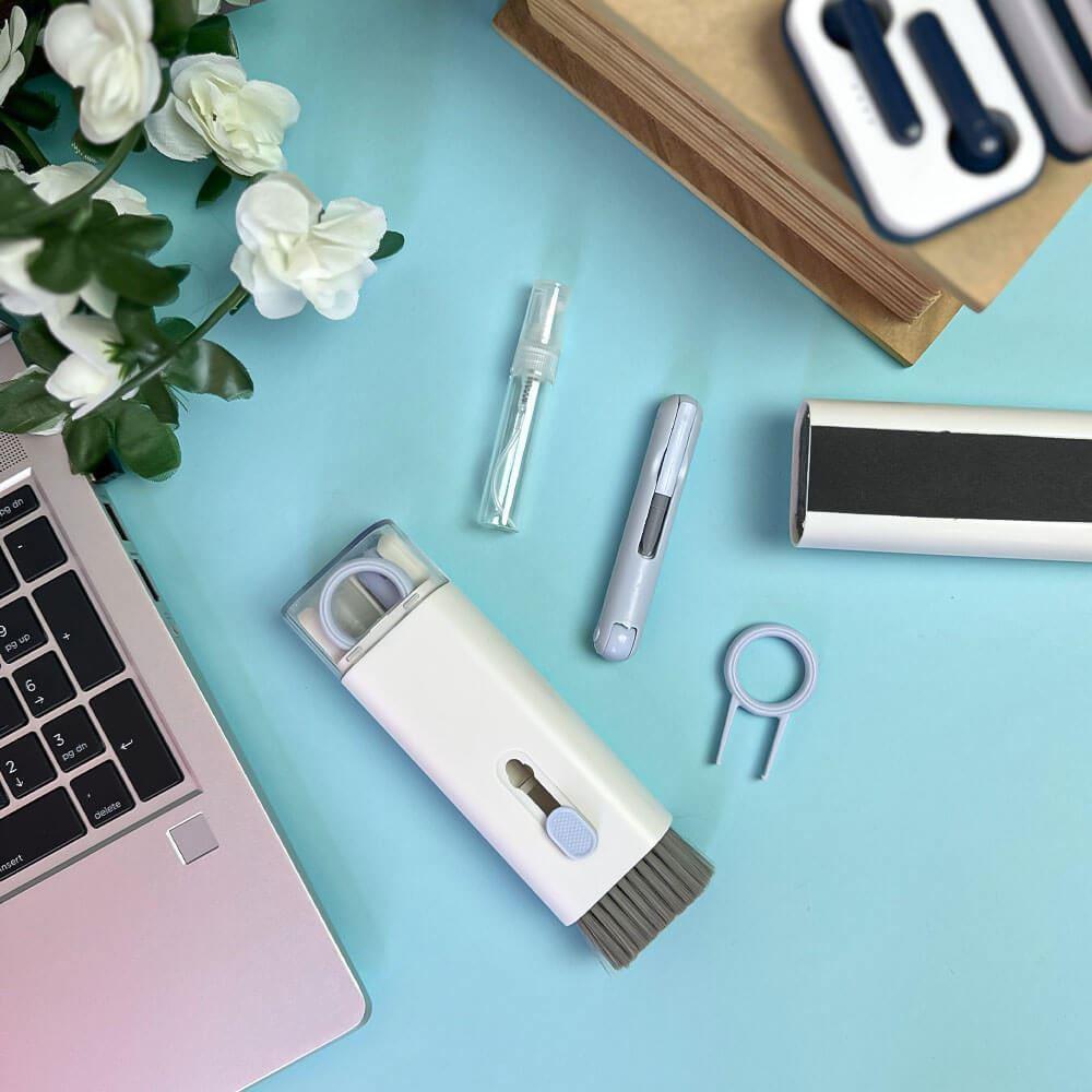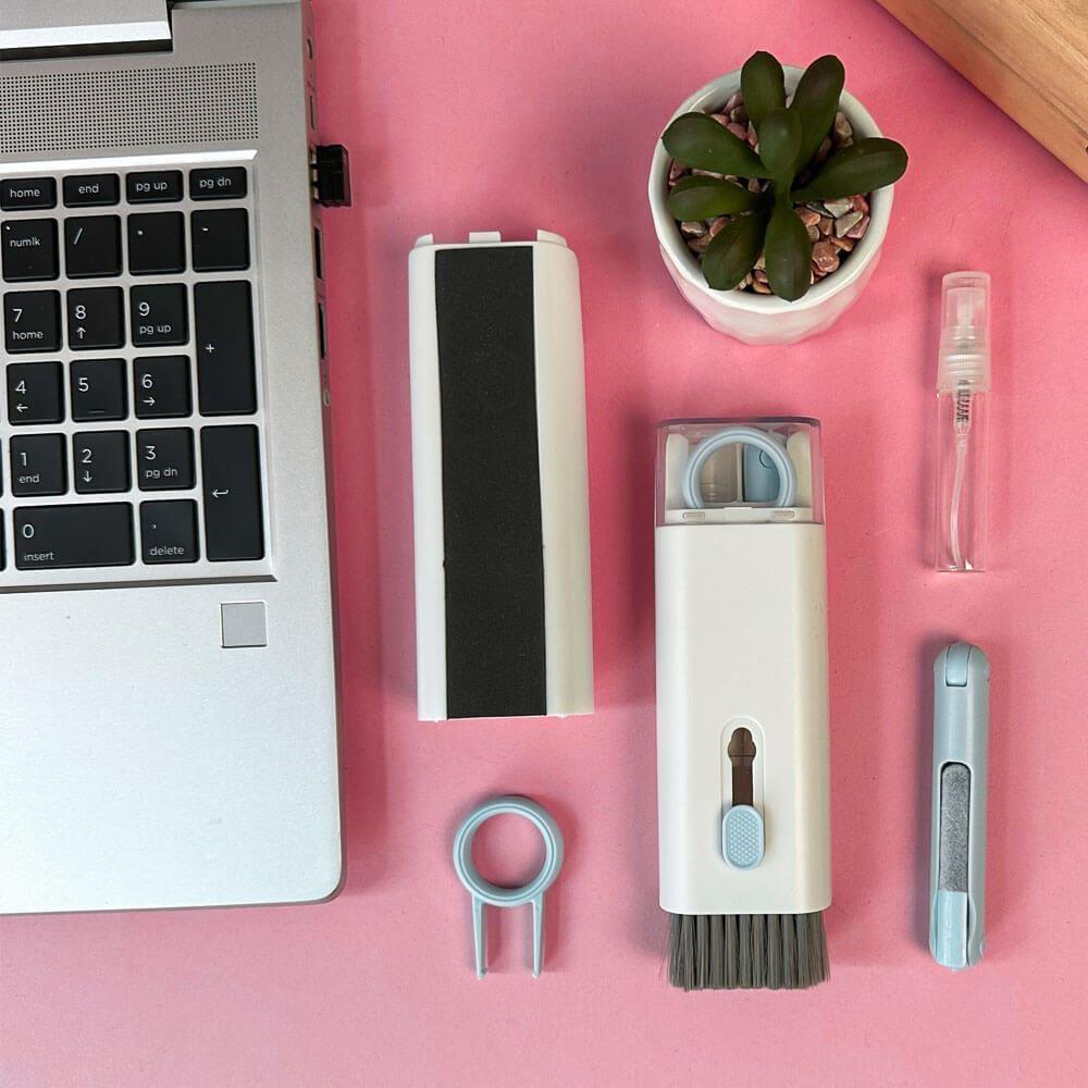 V multifunkčnej sade nájdete kefku na klávesnicu, čistič displeja, nádobku na vodu, pomôcku na sňatie tlačidiel z klávesnice a tri kefky – jednu na čistenie úložného priestoru slúchadiel, druhú na čistenie špuntov v slúchadlách a poslednú na čistenie povrchu slúchadiel, takže všetko potrebné pre čistotu vašich zariadení máte v jednom.
