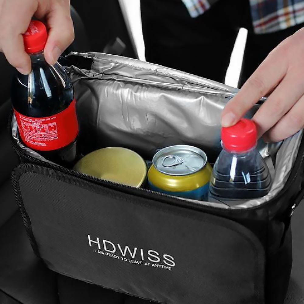 Multifunkčná taška do auta s izolačnou vrstvou udrží vaše potraviny v teple alebo v chlade. Pohodlne sa prenáša vďaka rukoväti či popruhu na rameno, ktorého dĺžku si môžete upraviť podľa svojich potrieb. Tašku využijete aj ako veľmi praktický držiak drobností v aute. Po odklopení vonkajšieho vrecka možno do transparentnej fólie uschovať napríklad tablet. Pohodlne môžete sledovať film a skrátiť si tak dlhú chvíľu pri cestovaní.