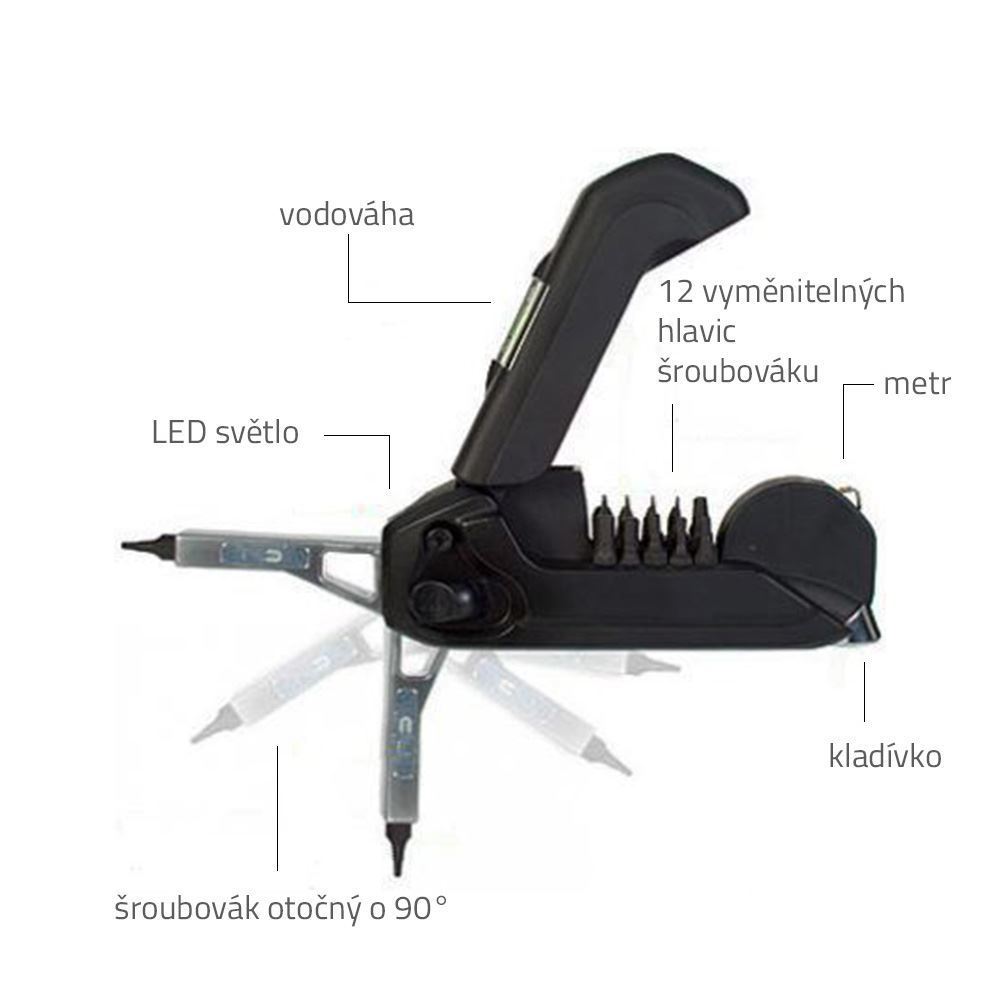 • Funkcia: 12 vymeniteľných hlavíc, telo skrutkovača, vodováha, meter, magnet, svetlo, kladivko (klopadlo)