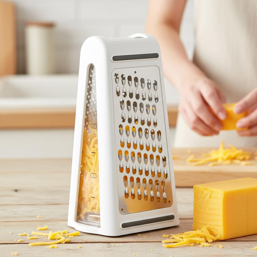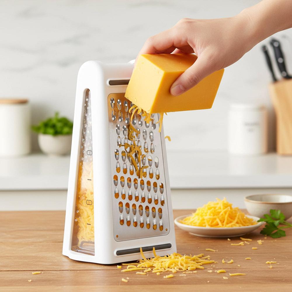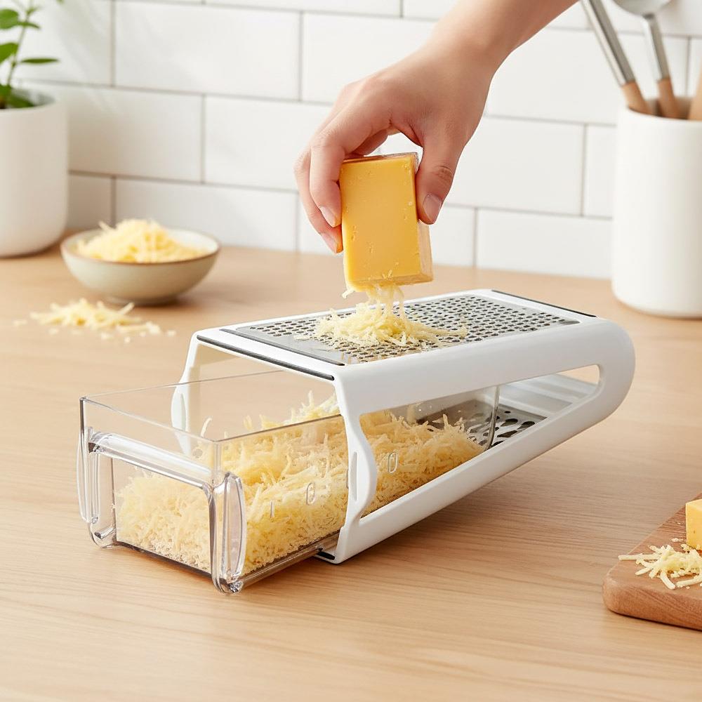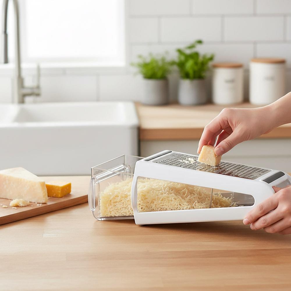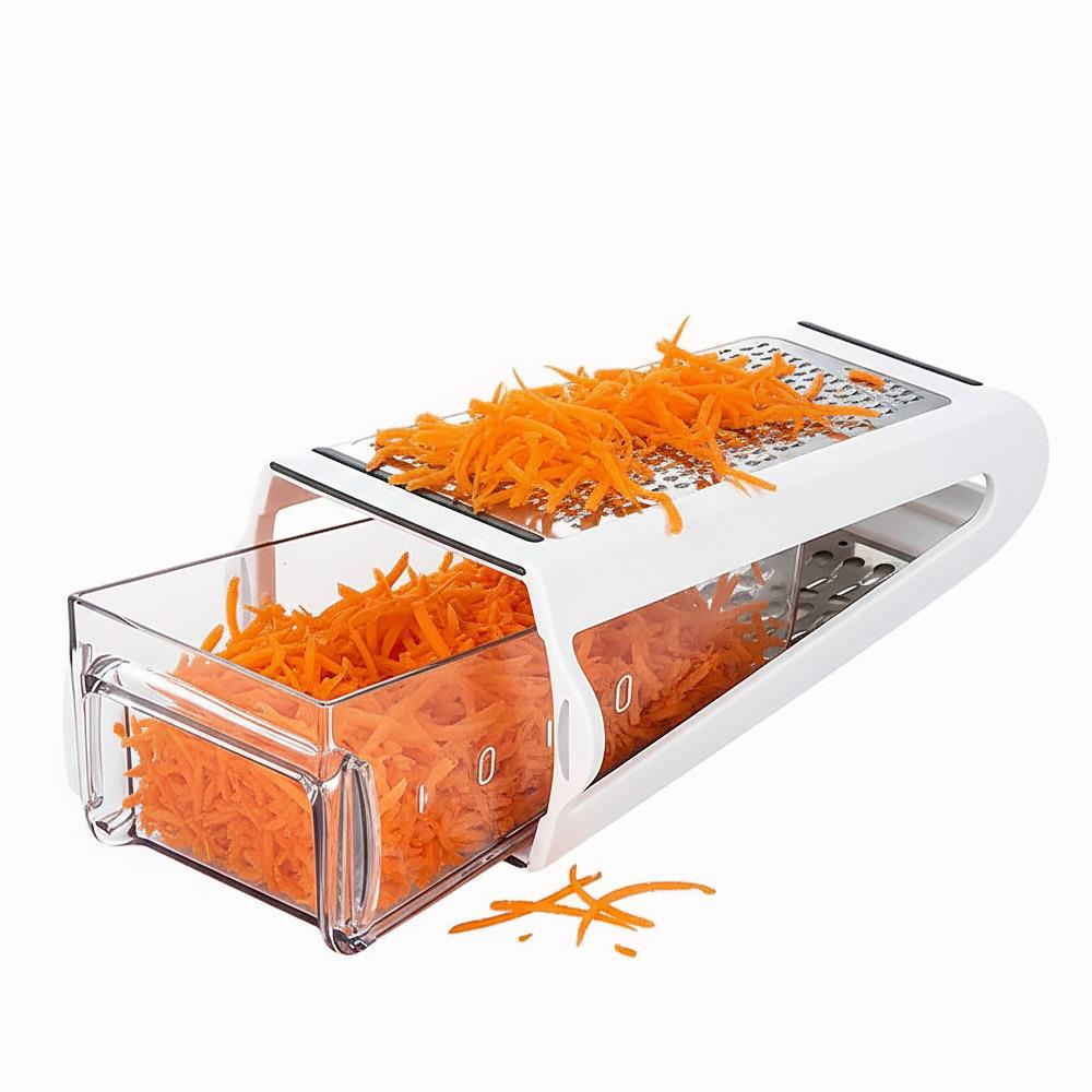 • Zásobník zabezpečí strúhanie bez neporiadku a slúži aj ako miska