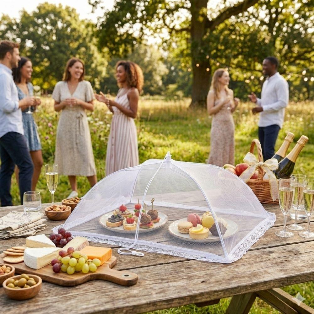 Ochranná sieťka na potraviny je praktickým pomocníkom pri stolovaní vonku. Spoľahlivo chráni jedlo pred hmyzom aj ďalšími nečistotami a zároveň vďaka jemnej sieťovine umožňuje prehľad o obsahu. Stačí ju jednoducho rozložiť a prikryť pripravené pokrmy.