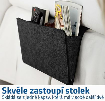 Tento organizér ho dokáže skvele zastúpiť a pritom pojme všetky potrebné veci. Do organizéra sa zmestí napríklad kniha, okuliare, perá, časopisy, ovládač alebo iné drobnosti. Organizér je vhodný na zavesenie za rám postele. Je možné ho využívať nielen pri posteli, ale tiež ho mať na okraji pohovky. Ponúka dostatok miesta, pretože sa skladá z jednej hlavnej kapsy, ktorá v sebe má ďalšie dve menšie kapsy.