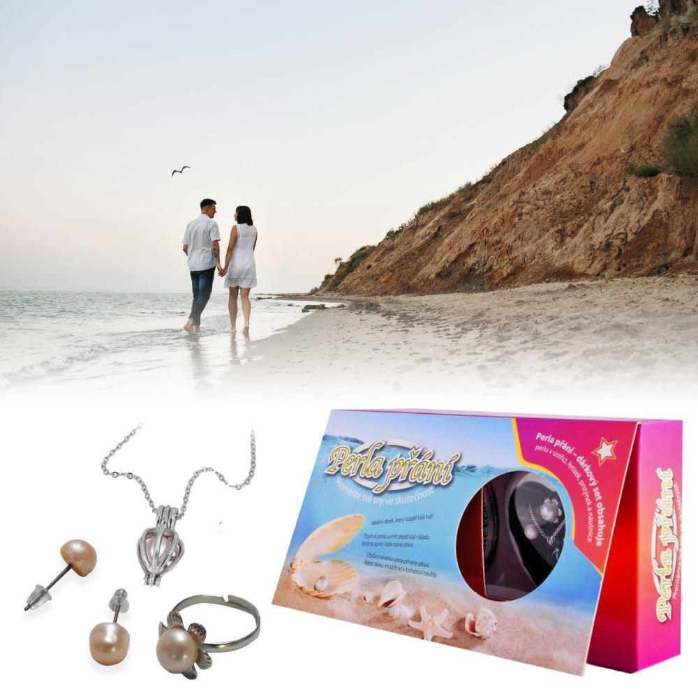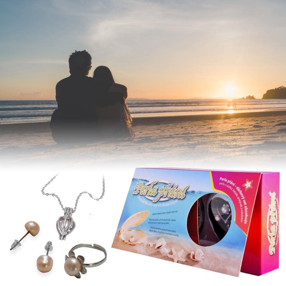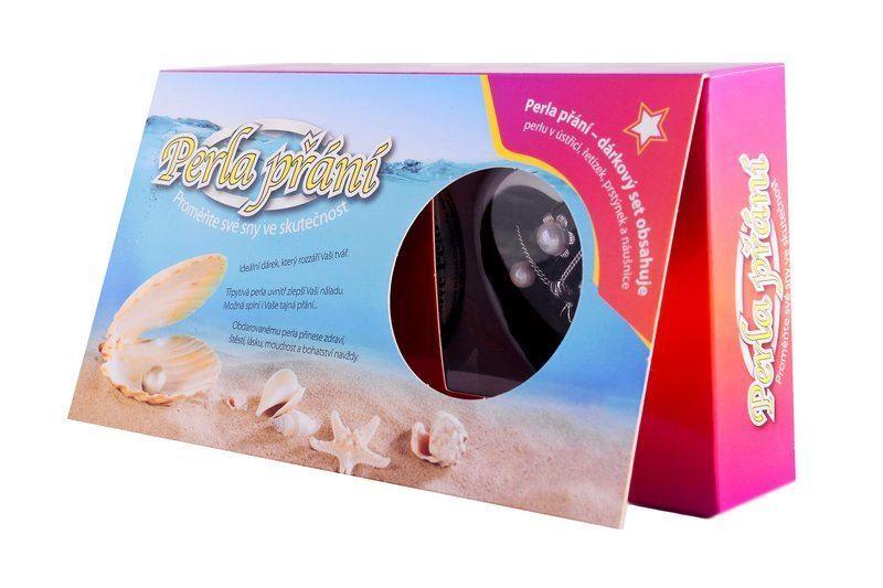 A čo je tou najväčšou zaujímavosťou? Vo vnútri balenia sa nachádza mušľa ustrice a v nej farebná perla priania. Žena si sama perlu vyberie a vloží do prívesku. Získa tak veľmi originálny šperk, ktorý môže neustále nosiť. K tomu sú v balení ešte navyše nádherné náušnice a prsteň. Celá sada je nádherne dizajnovo navrhnutá a šperky spolu ladia. Perla priania v sebe ukrýva ďalšie tajomstvo, pretože nikdy neviete, v akej bude farbe, a pritom každá farba niečo znamená. Perla vznikla z zrnka piesku a dorástla do veľkosti 5–8 mm.