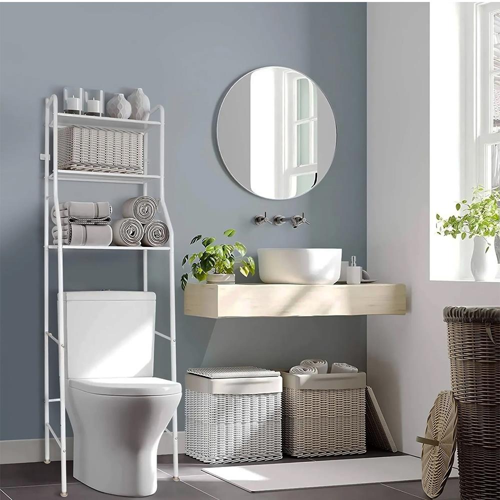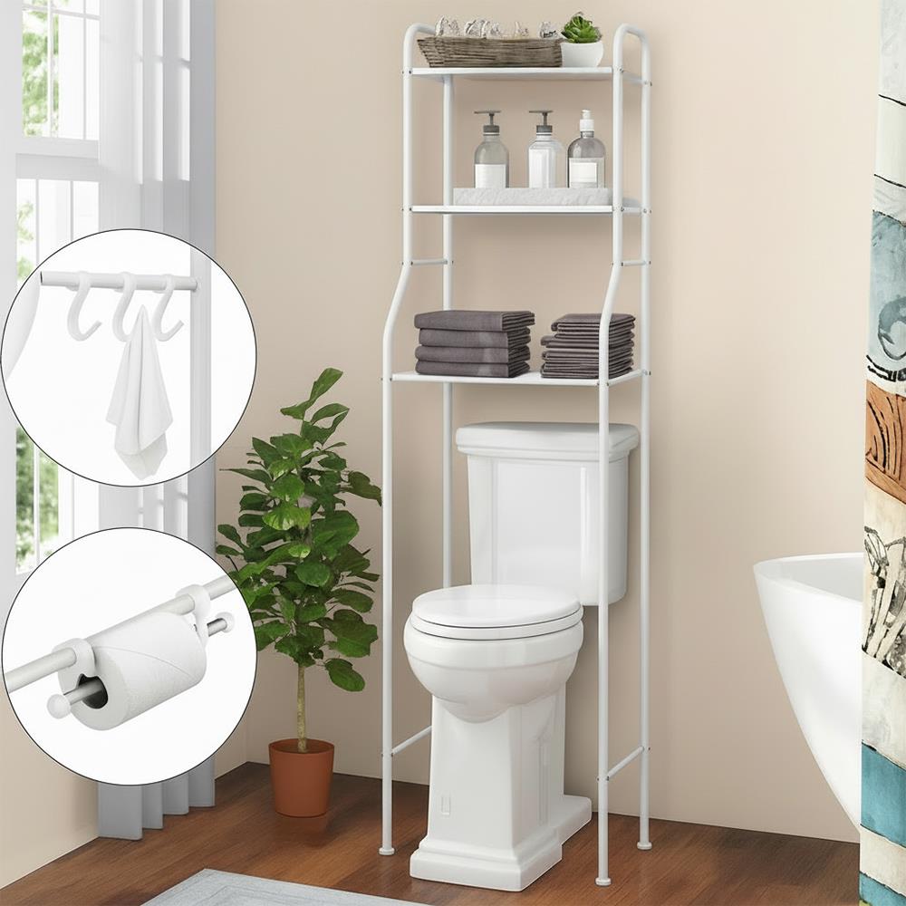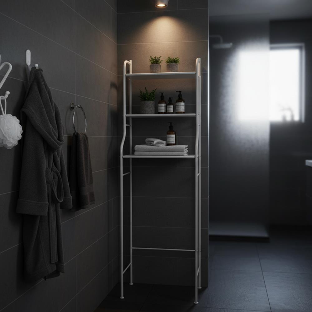 Majte svoju kúpeľňu prehľadnú a elegantnú vďaka tomuto praktickému policovému regálu nad toaletu. Inteligentný dizajn umožňuje maximálne využiť vertikálny priestor. Tri priestranné police poskytnú dostatok úložného priestoru na uteráky, toaletné potreby, dekorácie či čistiace prostriedky. Vďaka pevnej kovovej konštrukcii je regál stabilný a odolný, zatiaľ čo minimalistický biely dizajn krásne zapadne do akéhokoľvek interiéru. Skvelé riešenie pre tých, ktorí chcú mať všetko po ruke – a pritom štýlovo usporiadané.