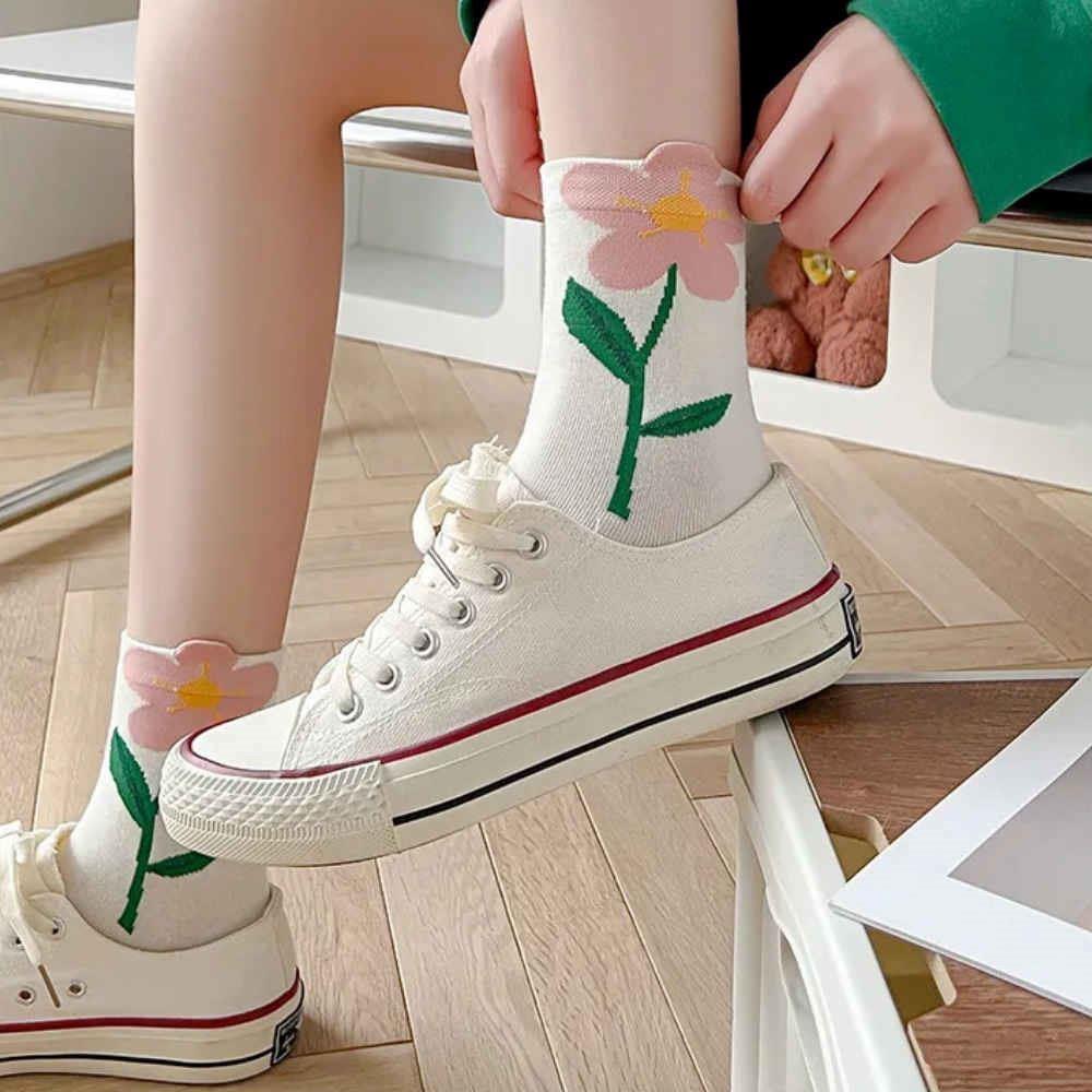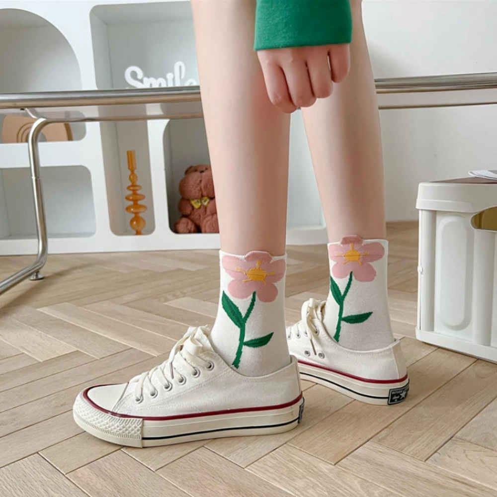 Nechajte svoje nohy rozkvitnúť s našimi členkovými ponožkami s kvetmi! Ponožky vynikajú práve čistým moderným dizajnom, ktorý tvorí len krémová podkladová farba a jednoduchý vzor kvetu, ktorý jemne presahuje lem ponožky. Tento dizajnový prvok je síce zdanlivo nenápadný, ale môžete sa spoľahnúť, že tým upútate pozornosť svojho okolia.