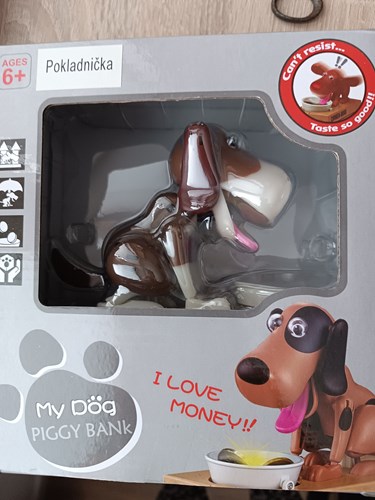 Roztomilá pokladnička v podobe nenásytného psíka. U detí úplne zaboduje! Psík má stále hlad, ale ak si myslíte, že by ste u neho uspeli s granulami, tak ani nápad! Ak neveríte, stačí vložiť mincu do psej misky a môžete sa presvedčiť sami. Psík v okamihu ožije a vloženú mincu prehltne skôr, než sa nazdáte. A čo sa mincami vlastne stane potom? Napovie vám dvierka umiestnená v prednej časti pokladničky.