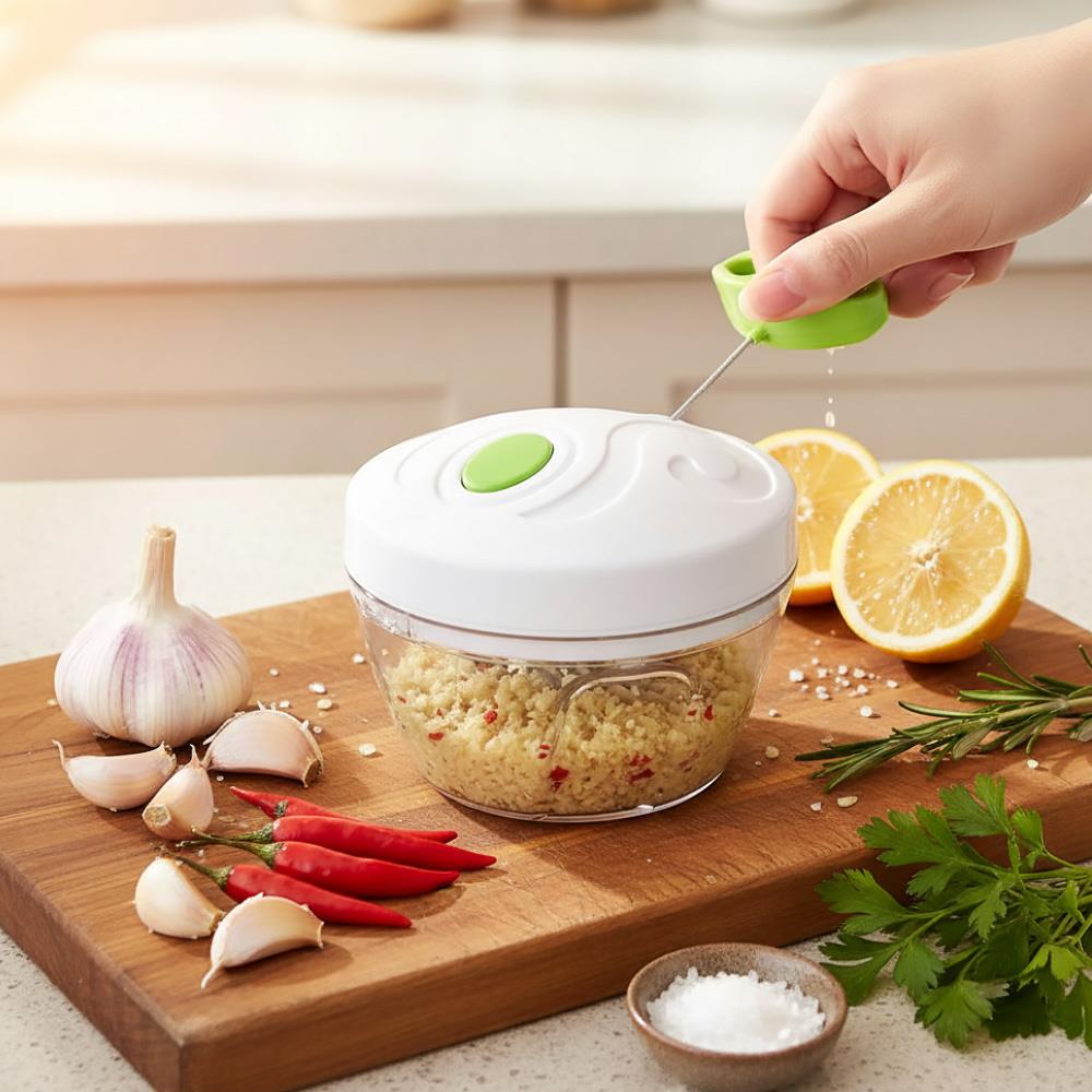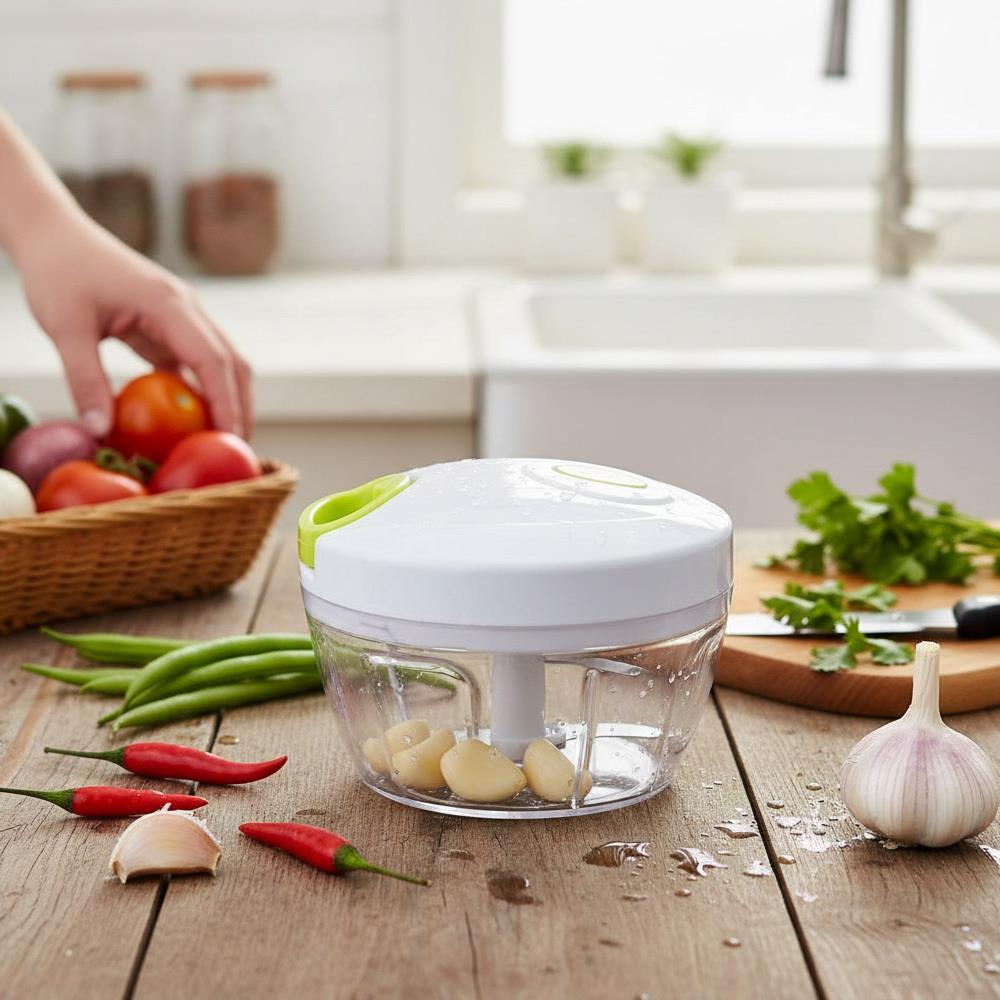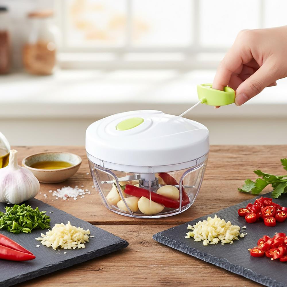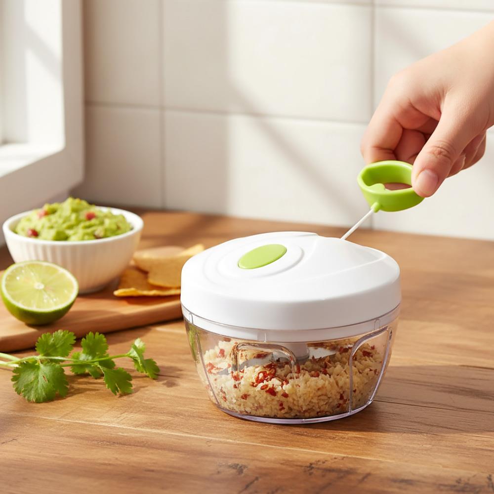 S týmto kuchynským sekáčikom nasekáte ovocie alebo zeleninu jednoducho a rýchlo! Ingrediencie vložte do misky, zavrite misku pomocou veka a zatiahnite za ťahadlo na šnúrke. Platí, že čím rýchlejšie a s väčšou silou budete ťahadlom manipulovať, tým viac bude potravina nasekaná. Vo vnútri misky je vrtuľa s tromi ostrými čepeľami, ktorá zaručí veľmi jemné nasekanie.