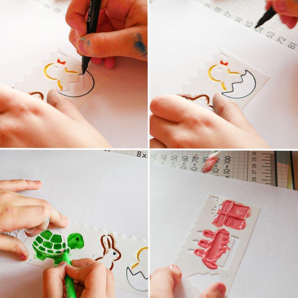 So šablónami teraz bude hračka pre dieťa vytvoriť bezchybný obrázok vďaka precíznym tvarom v predlohe. Stačí šablónu priložiť na papier a prejsť ju štetcom s farbou, fixkou, pastelkou alebo vytupovať predlohu.