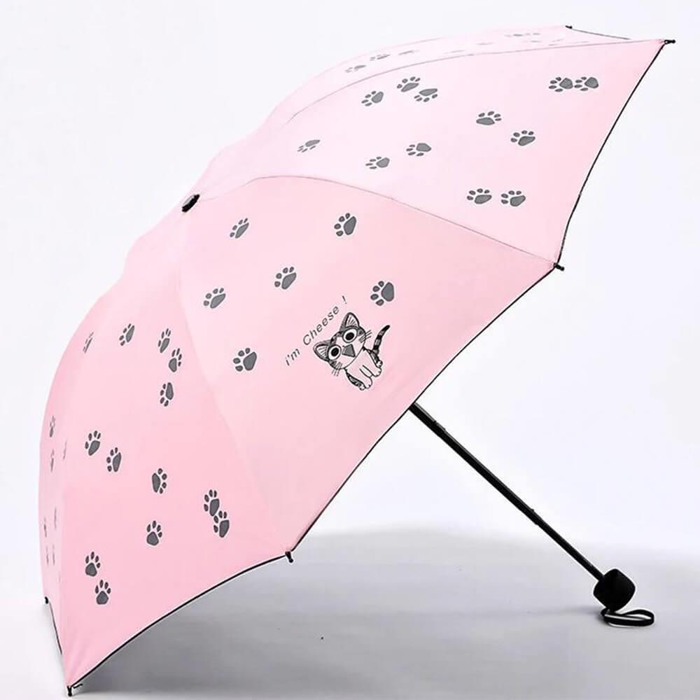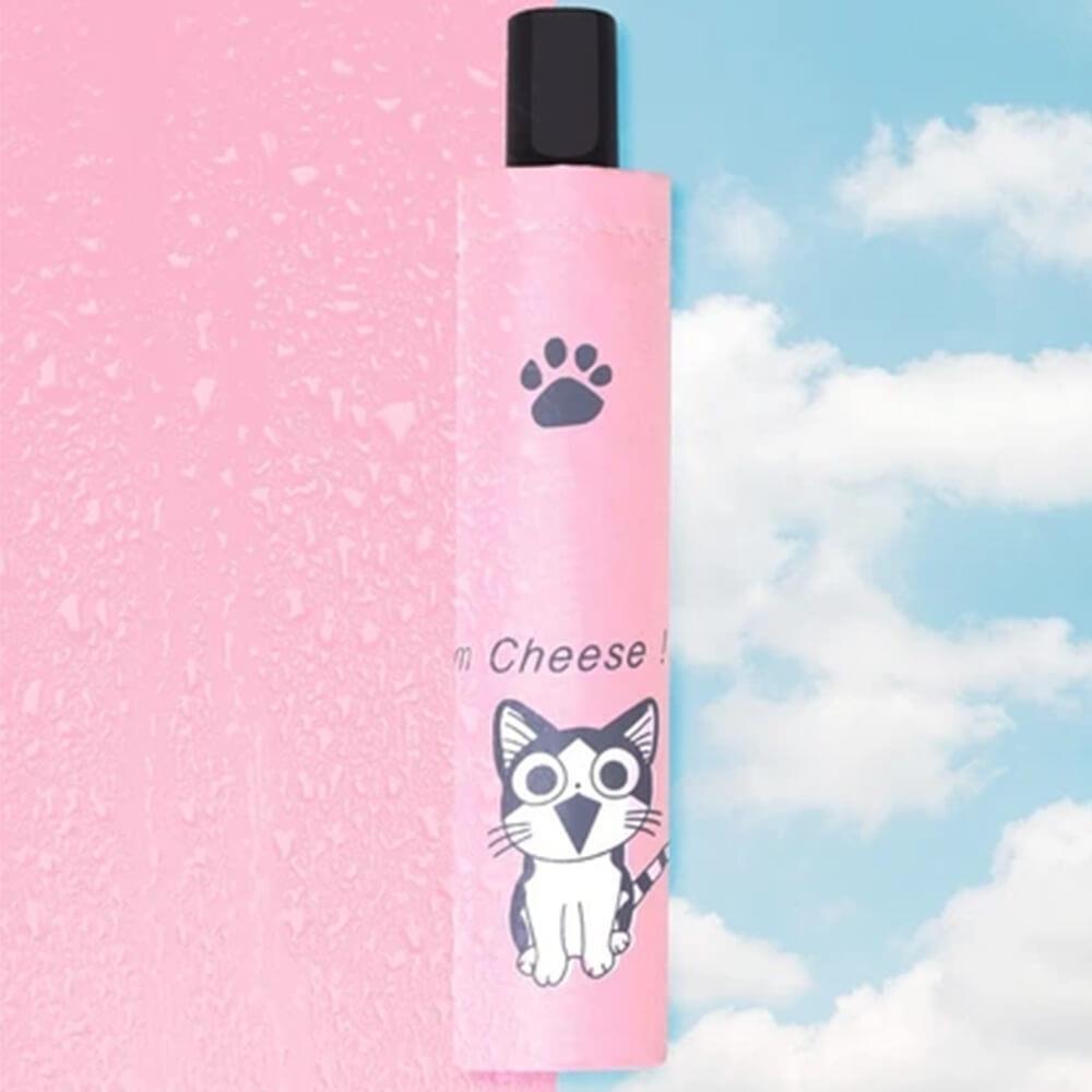 Dodejte daždivým dňom štipku radosti s týmto roztomilým skladacím dáždnikom! Jemná pastelová farba, štýlové labky a veselá mačička dodajú vášmu outfitu hravý nádych, zatiaľ čo pevná konštrukcia a vodeodolný materiál zaručia, že zostanete v suchu aj pri nečakanom lejaku.