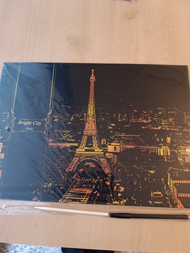 Balenie obsahuje pero, predtlačenú šablónu podľa ktorej budete stierať a voľný čistý hárok, kde sa po zotretí vyobrazí nádherná scenéria Paríža. Po dokončení možno obraz nechať zarámovať a vyvesiť si ho kdekoľvek v interiéri.