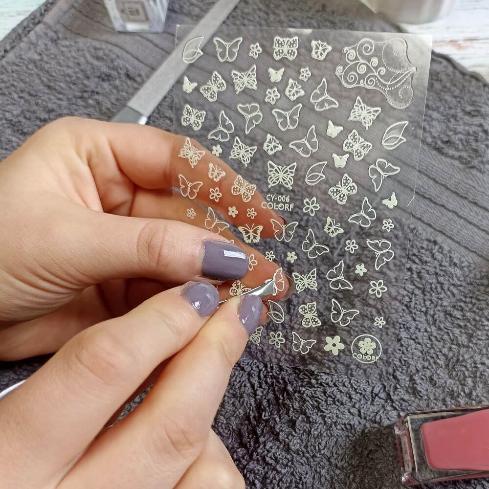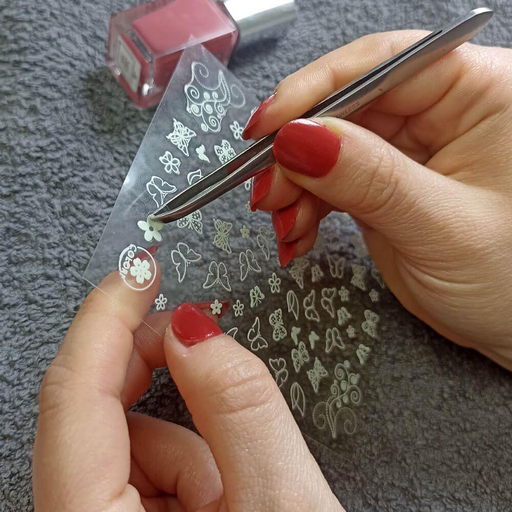 Samolepky možno lepiť na základnú vrstvu laku alebo priamo na necht. Sú vhodné tak na prírodné nechty, ako aj na umelé. Samolepku stačí jednoducho uchytiť pinzetou a naniesť ju na necht. Po nalepení je vhodné samolepky zafixovať záverečným priehľadným lakom.