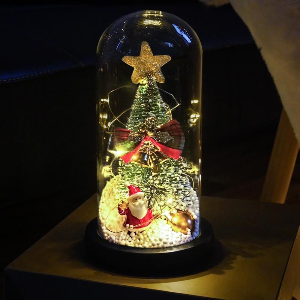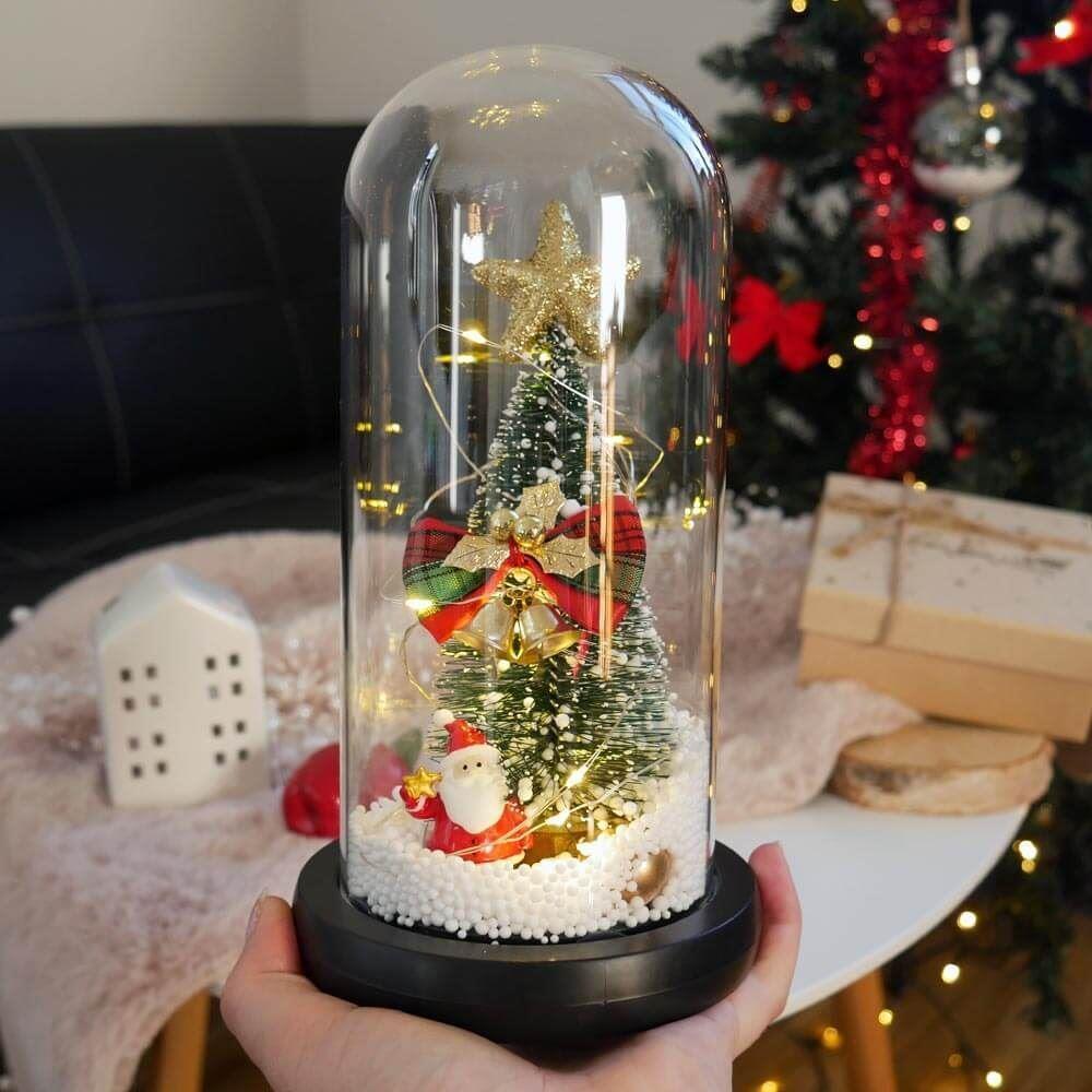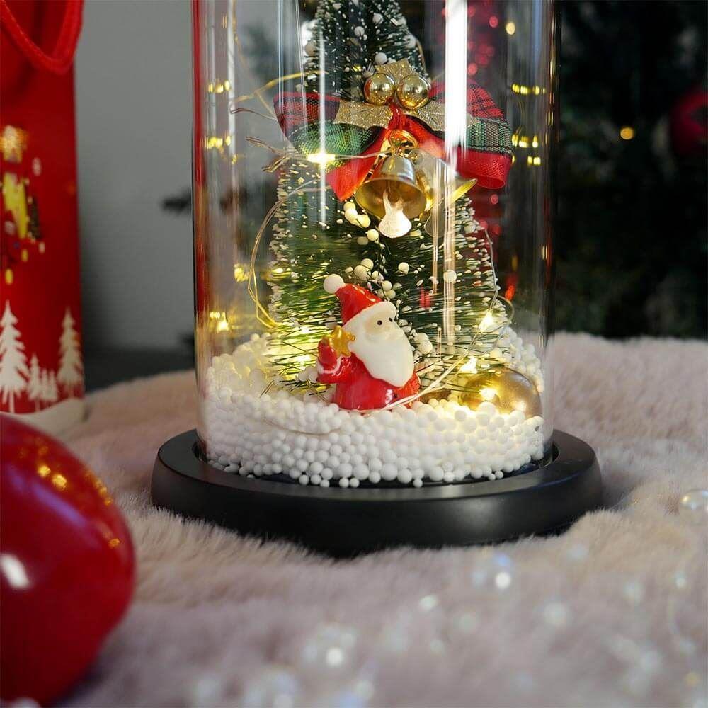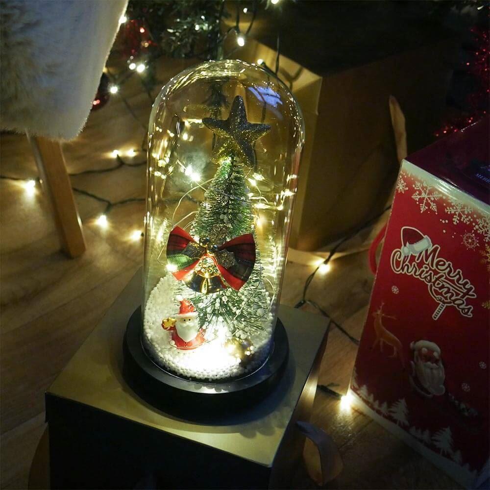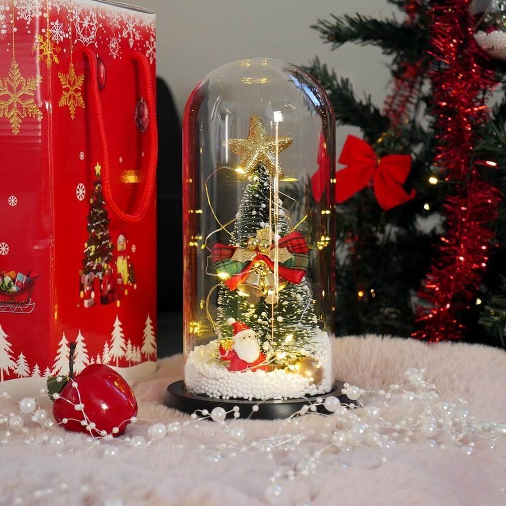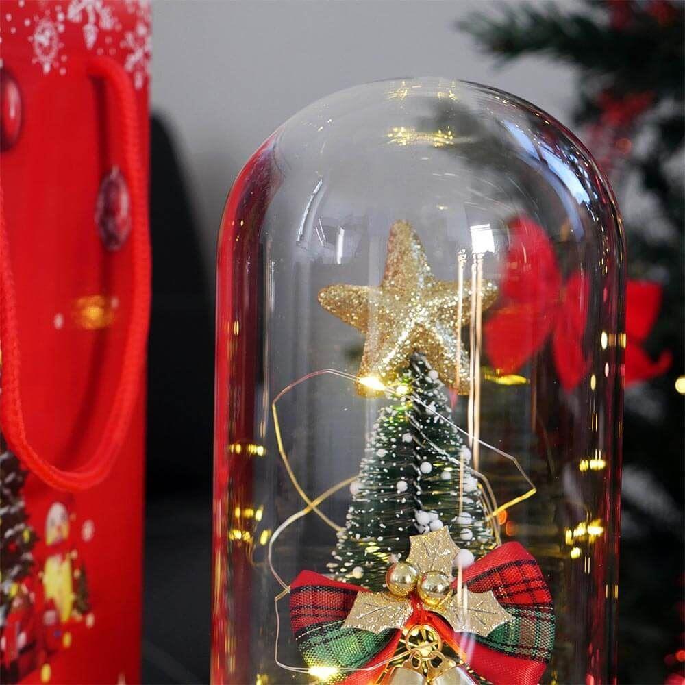 Svietiaci vianočný stromček v sklenenej váze v darčekovom balení