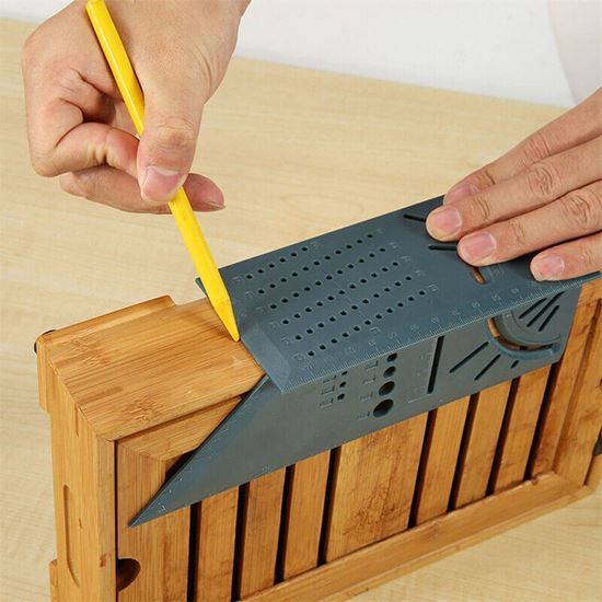A ako pravítko použijete? Priložte ho na hranu a využite jednu z funkcií, ako je napríklad uhlomer, pravítko, otvory na hrubé odmeranie veľkosti vrtáka, alebo otvory na jednoduché vytvorenie rovnobežiek s hranou. Ak používate otvory na vytváranie rovnobežiek, vložte hrot ceruzky do príslušného otvoru a posuňte celé pravítko. Hodnoty napísané na hrane strany s hrotom sú uhly. V prípade potreby utrite navlhčenou handričkou.