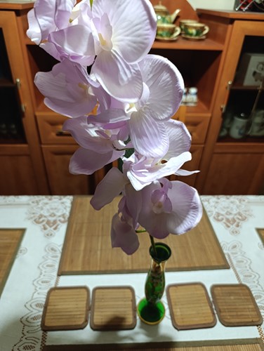 Kvetina je v realistickej veľkosti aj farbe. Má niekoľko rozkvitnutých kvetov a dokonca aj niekoľko púčikov. Je to originálna kvetina, ktorá vydrží bez akejkoľvek špeciálnej starostlivosti. Občas ju stačí len utrieť od prachu.
