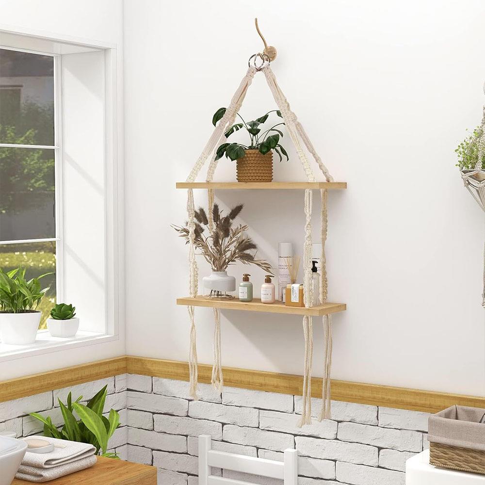 Závesná macrame polička s dvoma poschodiami je krásnym doplnkom pre všetkých, ktorí milujú boho štýl, prírodné materiály a útulné bývanie. Vďaka kombinácii drevených políc a textilných závesných šnúr pôsobí jemne, vzdušne a zároveň veľmi dekoratívne.